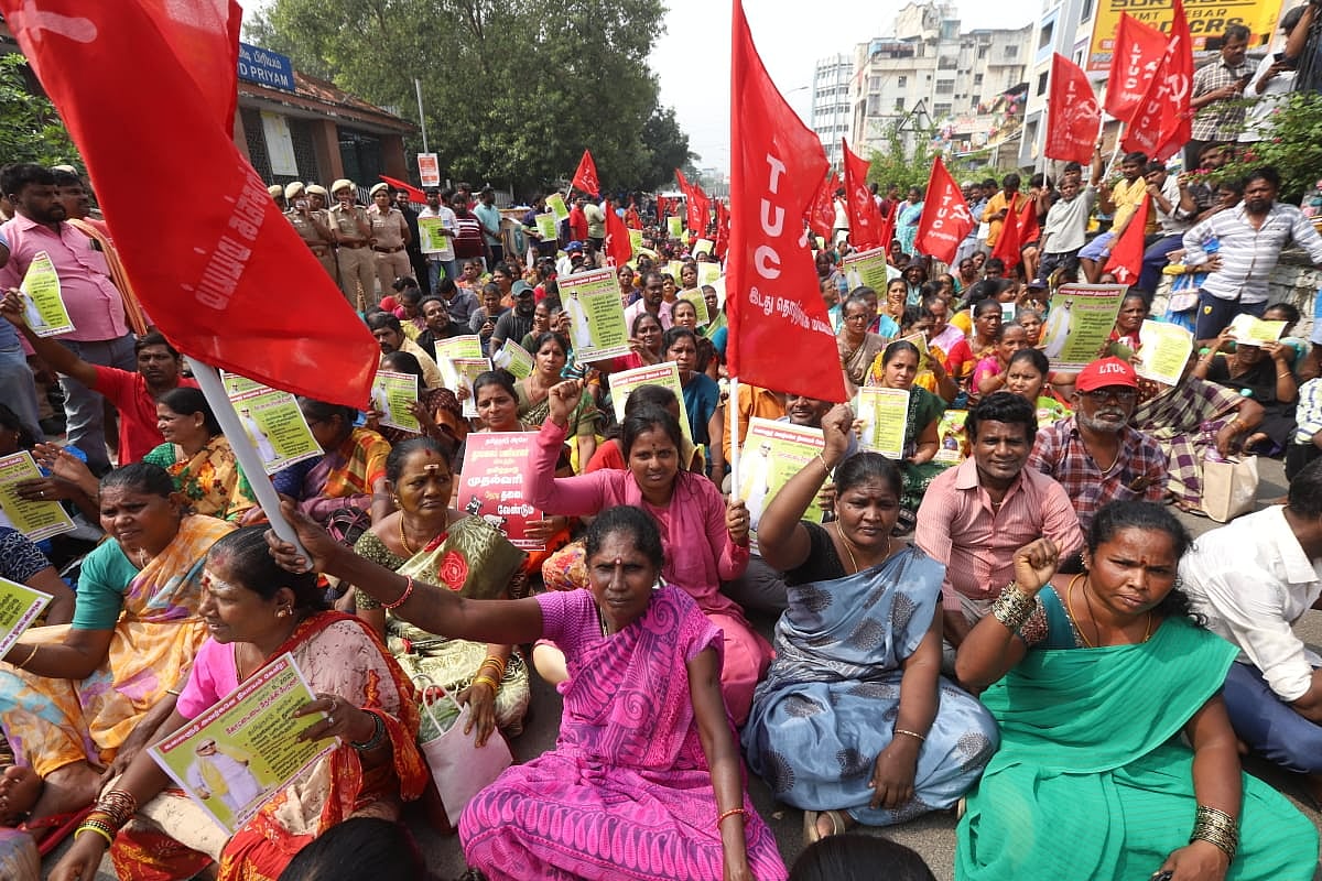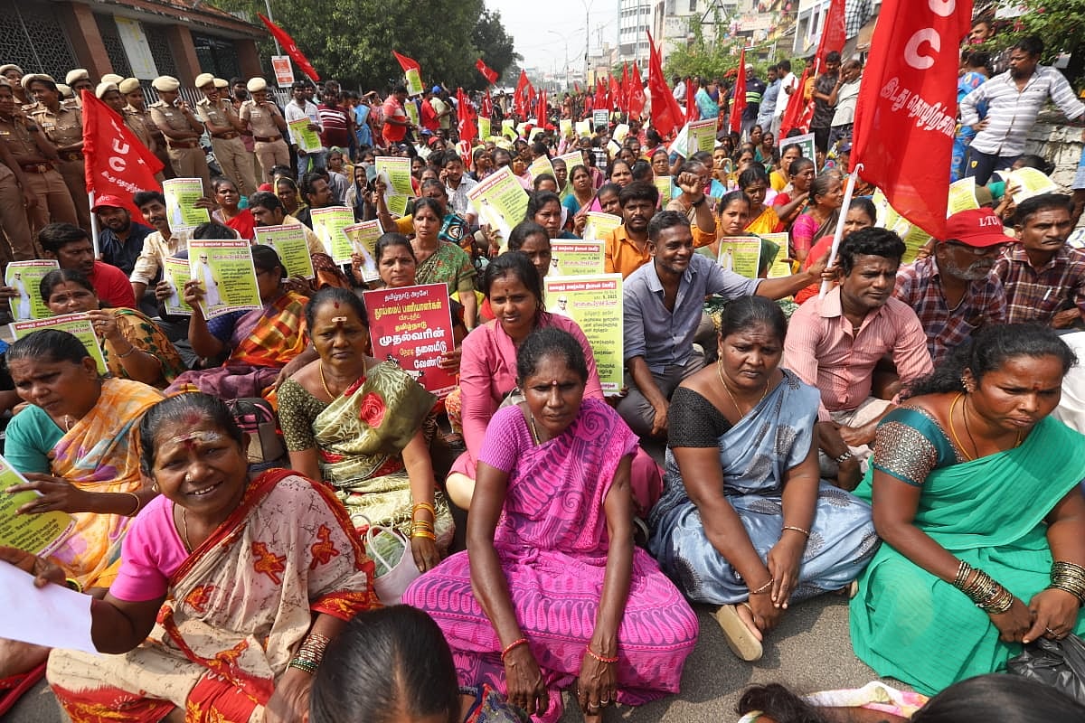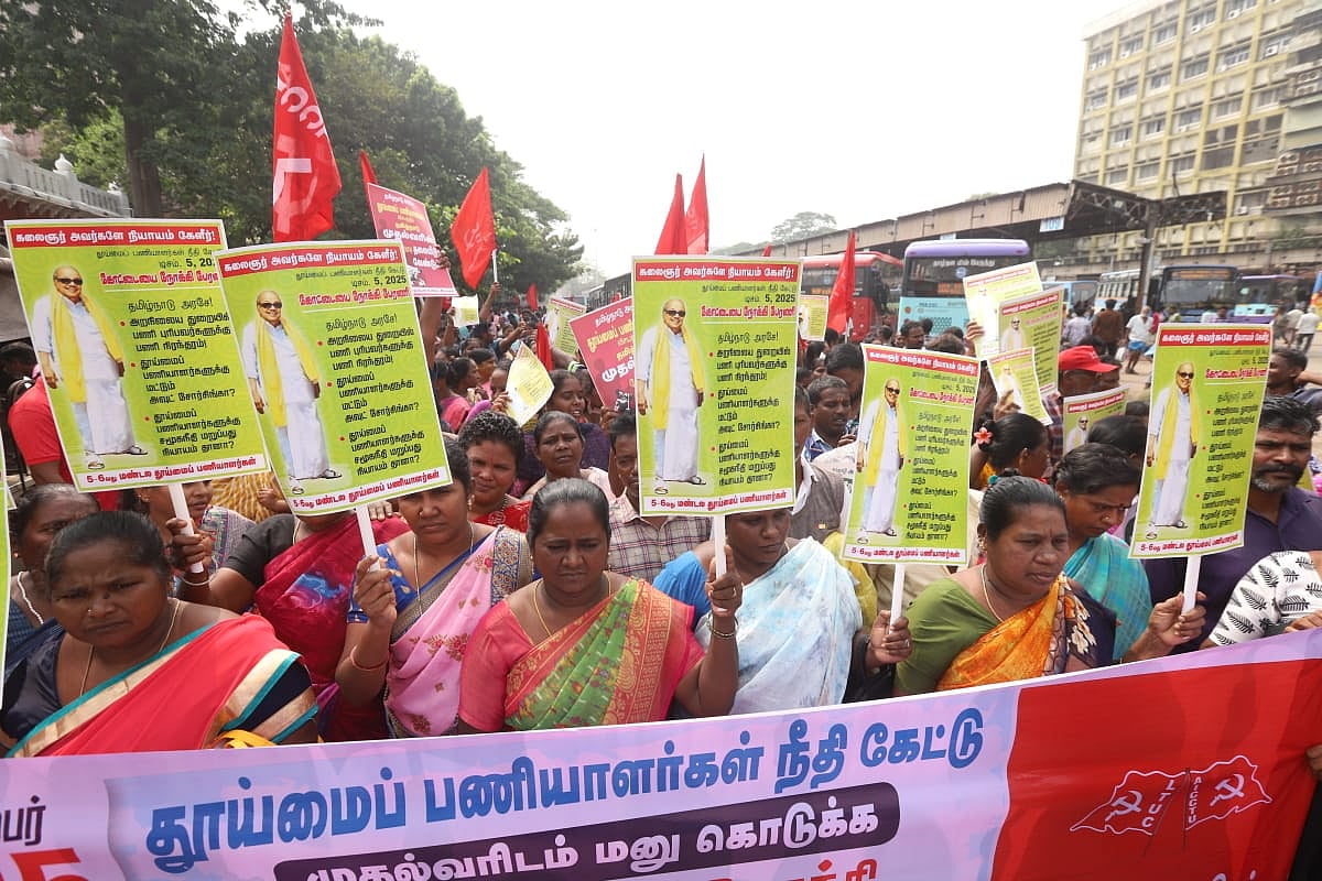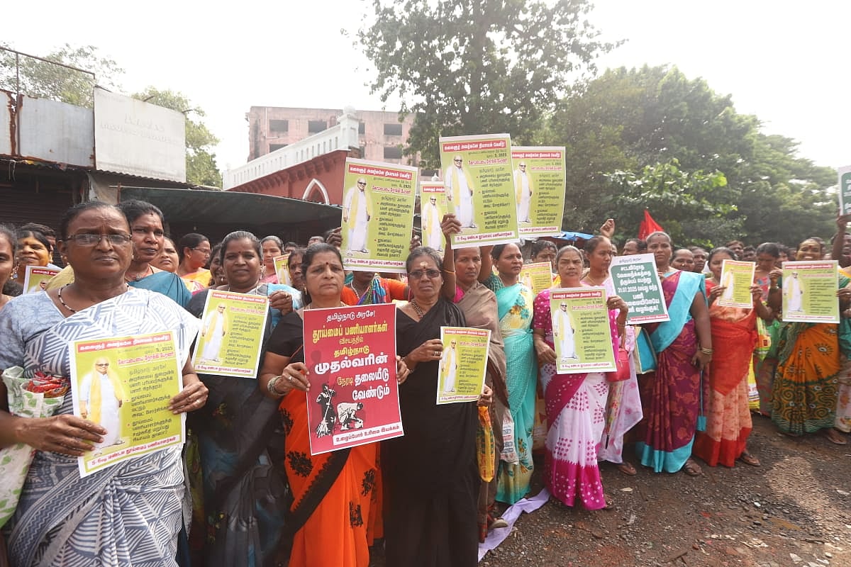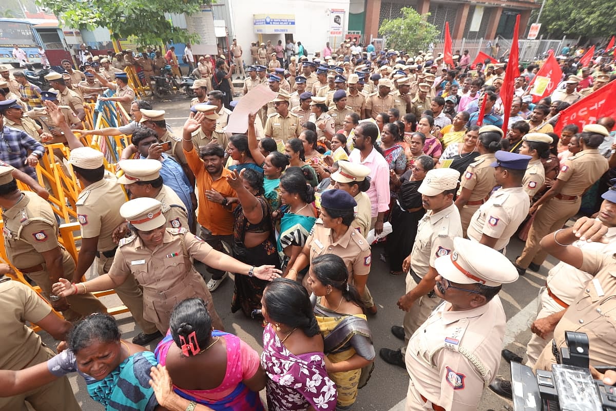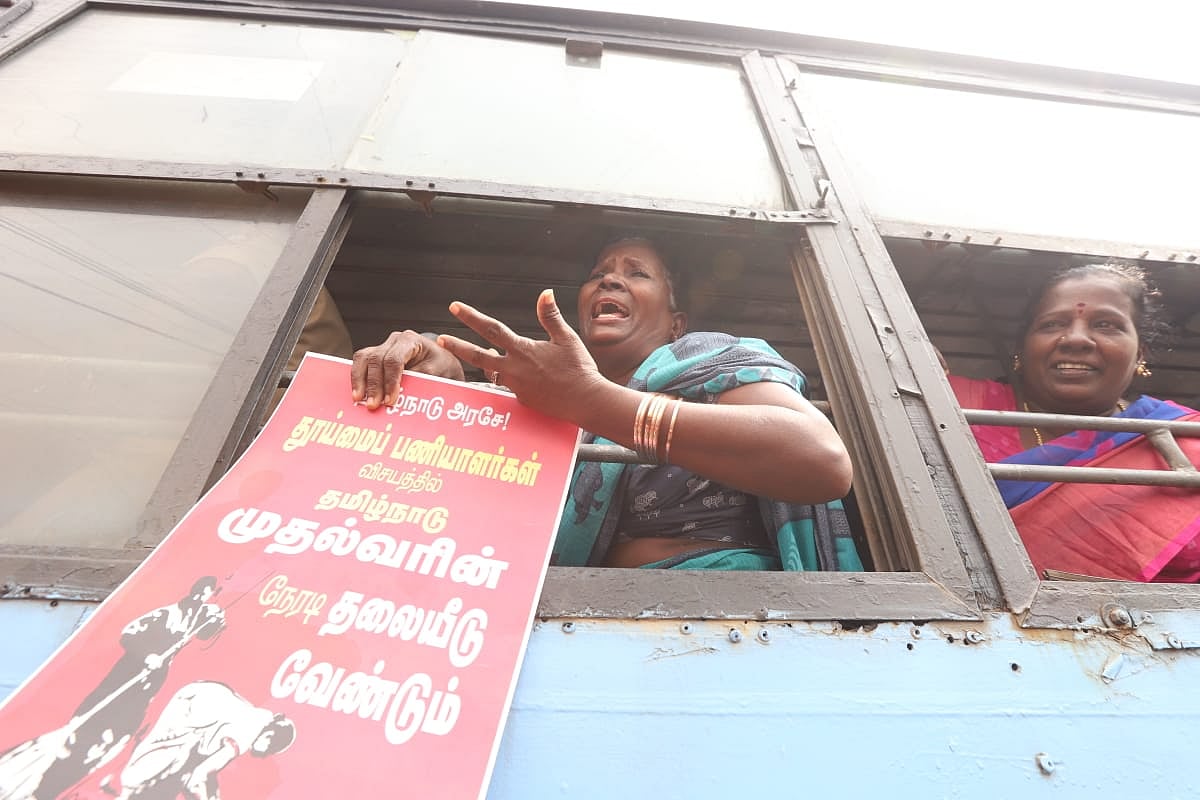 சென்னையில் மண்டலங்கள் 5 மற்றும் 6 ஐ சேர்ந்த தூய்மைப் பணியாளர்கள் பணி நிரந்தரம் வேண்டியும் தனியார்மயமாக்கலை எதிர்த்தும் 100 நாட்களுக்கும் மேலாக போராடி வருகின்றனர். இந்நிலையில், இன்று குறளகம் அருகே இருந்து தலைமைச் செயலகத்தை நோக்கி பேரணி செல்ல முயன்ற 800 க்கும் மேற்பட்ட தூய்மைப் பணியாளர்களை தடுத்து நிறுத்திய காவல்துறையினர் அவர்களை கைது செய்தனர்.