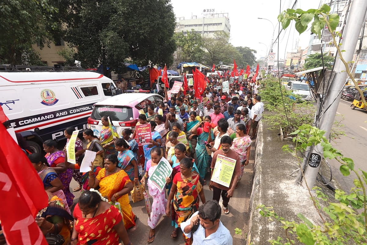இதனால் முன்னெச்சரிக்கையாக இன்று காலை 8 மணி முதலே குரளகம் பகுதியில் நூற்றுக்கணக்கான போலீசாரும் போராட்டக்காரர்களை கைது செய்ய 30 க்கும் மேற்பட்ட வேன்களும் பேருந்துகளும் குவிக்கபட்டது. சரியாக 11 மணிக்கு பேரணியை தொடங்கிய தூய்மைப் பணியாளர்கள் முதல்வருக்கு எதிராகவும் மாநகராட்சி ஆணையருக்கு எதிராகவும் கோஷங்களை எழுப்பிக் கொண்டே முன் நகர்ந்தனர்.