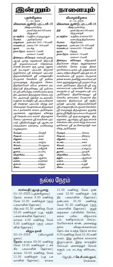 சரஸ்வதி/ஆயுத பூஜை 01-10-2025 (புதன்கிழமை) நேரம்: காலை 9.00 மணிக்கு மேல் 10.00 மணிக்குள் (குரு பகவானின் ஹோரை)
