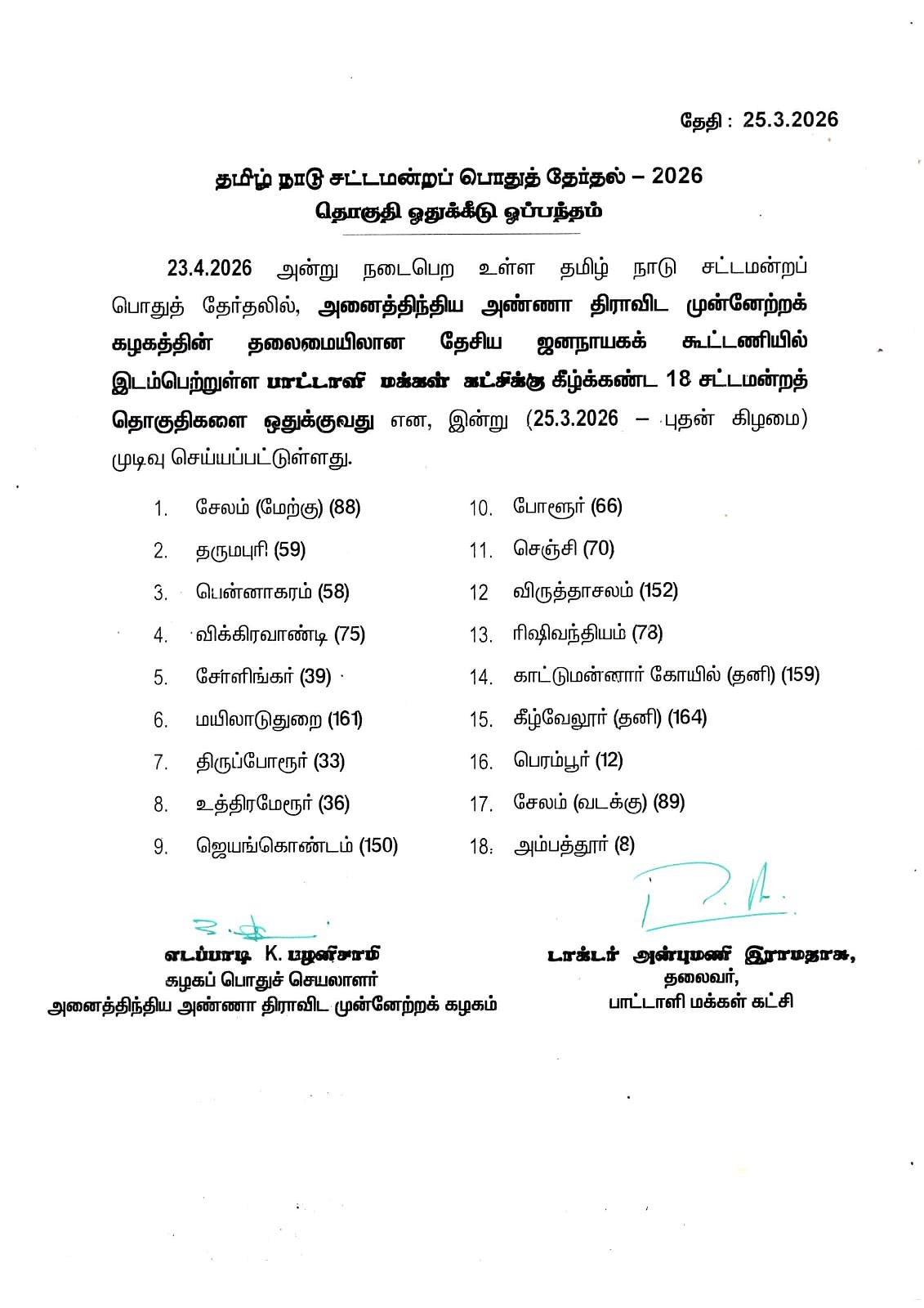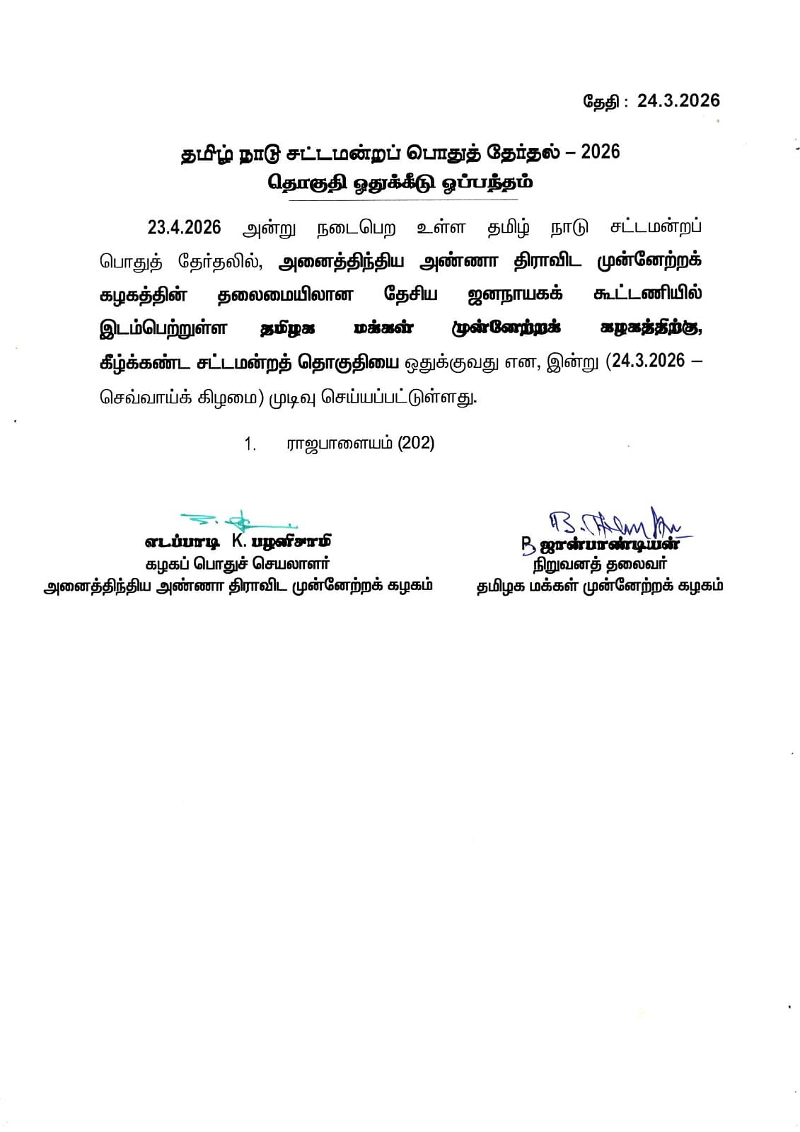 ஏப்ரல் மாதம் 23-ம் தேதி தமிழ்நாட்டில் சட்டமன்றத் தேர்தல் நடைபெற இருக்கிறது. இந்த தேர்தலுக்கான கூட்டணி பேச்சுவார்த்தைகள் தொடங்கி திமுக அதிமுக என இரு கட்சியிடையேயும் இழுபறியாகவே நீடித்தது. இந்த நிலையில், இரண்டு கட்சிகளும் தங்கள் கூட்டணிக் கட்சிகளுக்கான தொகுதிப் பங்கீட்டை இறுதி செய்து அறிவித்து வருகின்றன.