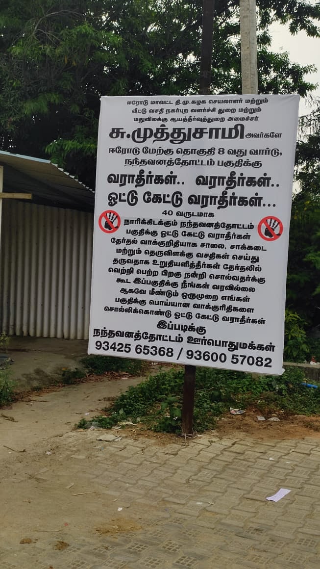 ஈரோடு மாநகராட்சிக்குட்பட்ட 8-ஆவது வார்டில் நந்தவனத்தோட்டம் என்ற பகுதி உள்ளது. இஸ்லாமியர்கள் அதிகம் வாழும் இந்தப் பகுதியில் புதன்கிழமை வைக்கப்பட்டிருந்த பிளக்ஸ் மாவட்ட அரசியல் தளத்தில் பரபரப்பை ஏற்படுத்தி உள்ளது. இந்த பிளக்ஸில், 40 ஆண்டுகளாக நந்தவனத்தோட்டம் பகுதியில் சாலை, சாக்கடை, தெருவிளக்கு போன்ற அடிப்படை வசதிகள் எதுவும் செய்து கொடுக்கப்படவில்லை. வாக்கு கேட்டு வந்தபோது, அடிப்படை வசதிகள் செய்துகொடுப்பதாக வாக்குறுதி அளித்தீர்கள். வெற்றி பெற்ற பிறகு நன்றி சொல்வதற்கு கூட இப்பகுதிக்கு வரவில்லை. ஆகவே, மீண்டும் ஒருமுறை எங்கள் பகுதிக்கு பொய்யான வாக்குறுதிகளை சொல்லிக் கொண்டு ஓட்டு கேட்டு வராதீர்கள் என அச்சிடப்பட்டிருந்தது. அந்த பிளக்ஸில் குறிப்பிடப்பட்டிருந்த செல்போன் எண்ணுக்கு அழைத்தோம்.