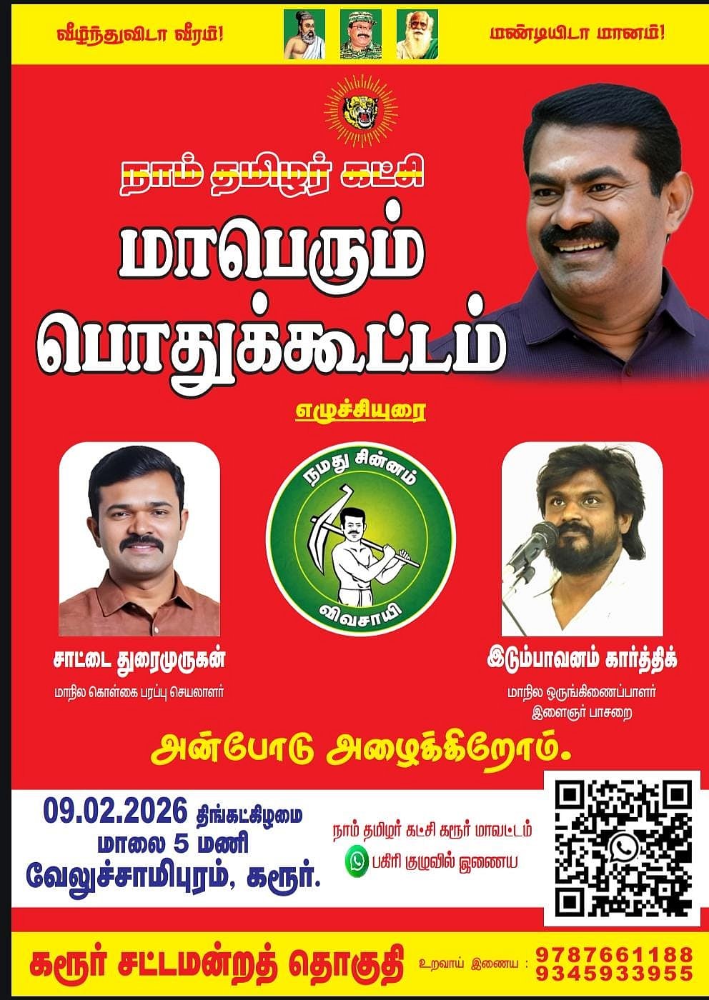 கரூர் வேலுச்சாமிபுரத்தில் நடந்த த.வெ.க தலைவர் விஜய்யின் பிரசாரக் கூட்டத்தில் நெரிசல் ஏற்பட்டு 41 பேர் பலியானார்கள். அதே வேலுச்சாமிபுரத்தில் 9.02.2025 நா.த.க பொதுக்கூட்டம் நடத்த கரூர் காவல்துறை அனுமதியளித்திருக்கிறது.