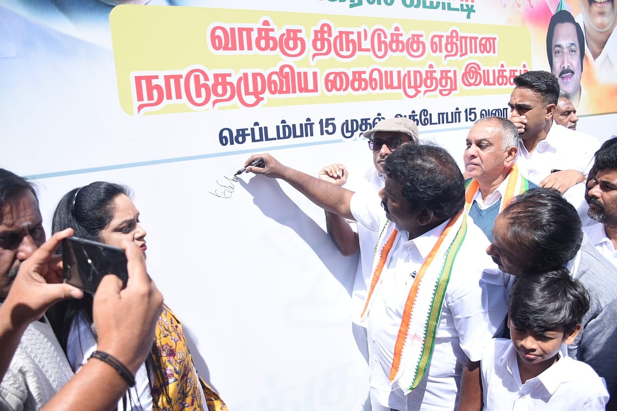 இதனைத் தொடர்ந்து செய்தியாளர்களைச் சந்தித்துப் பேசிய செல்வப்பெருந்தகை , " வாக்கு திருட்டைக் கண்டித்து நாடு முழுவதும் காங்கிரஸ் கட்சி பல்வேறு போராட்டங்களை நடத்தி வருகிறது. இதன் ஒரு பகுதியாக தற்போது கையெழுத்து இயக்கம் நடந்து வருகிறது. 6 கோடி கையெழுத்துகளைப் பெற திட்டமிடப்பட்டுள்ளது. தமிழ்நாட்டில் மட்டும் ஒரு கோடி கையெழுத்துகளைப் பெற்று ஜனாதிபதிக்கு அனுப்பி வைக்கப்படும்.