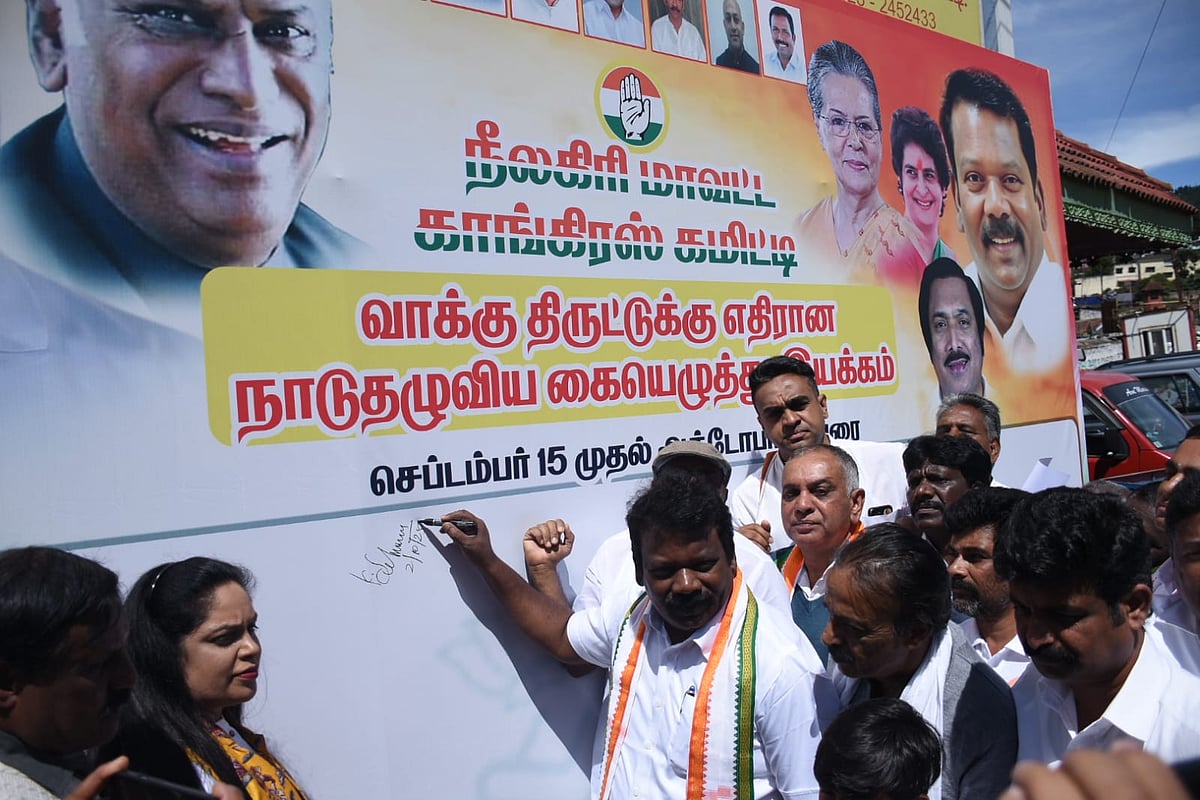 நாடாளுமன்ற தேர்தல் வாக்குத்திருட்டு விவகாரம் தொடர்பாக காங்கிரஸ் கட்சியினர் நாடு முழுவதும் கையெழுத்து இயக்கம் நடத்தி வரும் நிலையில், நீலகிரி மாவட்டம் ஊட்டியில் காங்கிரஸ் கட்சியின் மாநில தலைவர் செல்வப்பெருந்தகை தலைமையில் இன்று காலை கையெழுத்து இயக்கம் தொடங்கியது.