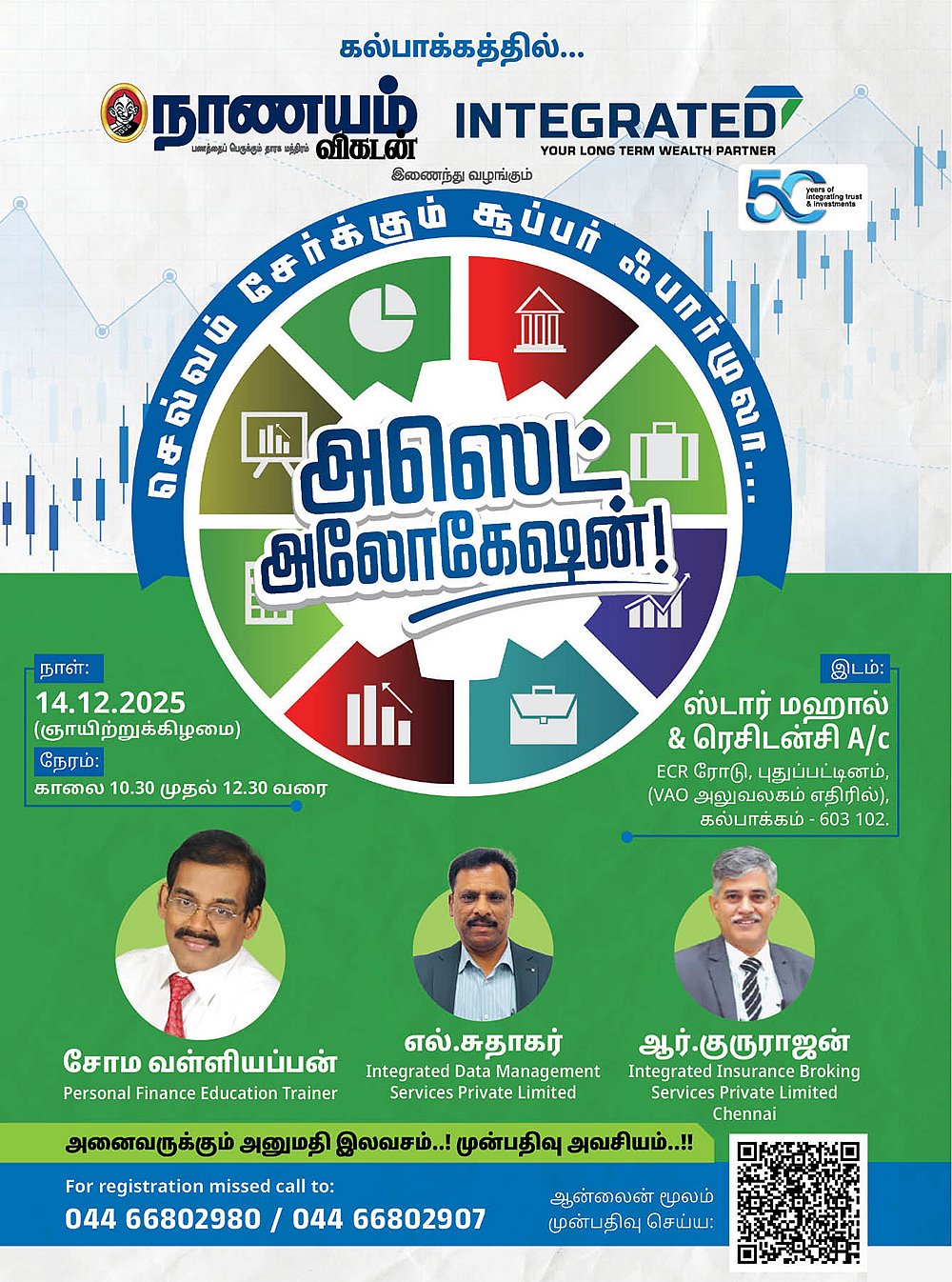 நாணயம் விகடன் & இன்டக்ரேட்டட் இணைந்து நடத்தும் ‘செல்வம் சேர்க்கும் சூப்பர் ஃபார்முலா… அஸெட் அலொகேஷன்!’ சிறப்பு நிகழ்ச்சி, கல்பாக்கத்தில் டிசம்பர் 14, ஞாயிற்றுக்கிழமை, காலை 10.30 முதல் மதியம் 12.30 வரை நடைபெறுகிறது.