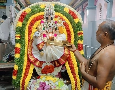 புகழ்பெற்ற இக்கோயிலில், புதன்கிழமை சரஸ்வதி அம்மனுக்கு காலையில் பால், தேன், இளநீா், சந்தனம், பன்னீா் போன்ற பல்வேறு வகையான திரவியங்களால் மகா அபிஷேகம் நடைபெற்றது. தொடா்ந்து, வெண்பட்டாடை உடுத்தி, சிறப்பு அலங்காரம் செய்யப்பட்டு, மகா தீபாராதனை காட்டப்பட்டது. இதில், ஆயிரக்கணக்கான பக்தா்கள் பங்கேற்று வழிபட்டனா்.