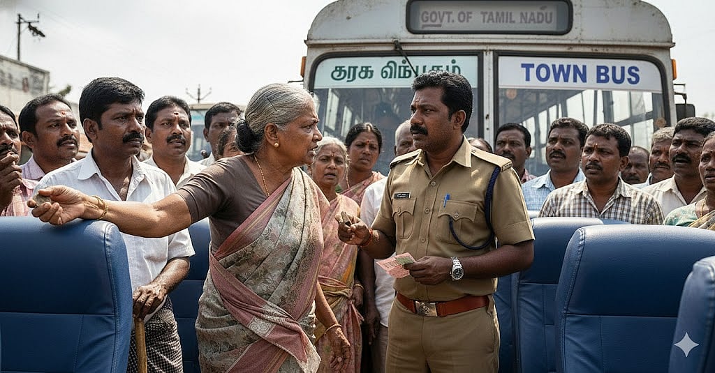 உன் கவர்மென்ட தூக்கி குப்பையிலே போடு. நான் பழைய டிக்கெட் காசு தான் தருவேன். சரிசரி நீ கொடுக்கிறத கொடு. மிச்சத்தை நான் போட்டு கட்டிக்கிறேன். நேரமாச்சு. வண்டியை எடுக்கணும். நீ யார்ரா என் டிக்கெட்டுக்கு காசு கொடுக்கறதுக்கு. பெத்தா பொறப்பா. நீ டிக்கெட்டை மாத்திக் கொடு. முடியாது பாட்டி. நீ வேணுமின்னா இறங்கி கம்மி டிக்கெட் பஸ்லே வா இறங்கு. பாட்டிக்கு வந்துச்சு பாரு கோபம். என்னாங்கடி என்னாங்கடா வாயைப் பொளந்து பார்த்துட்டு இருக்கீங்க. யாரும் எதுவும் தட்டிக்கேட்க மாட்டீங்களா.
