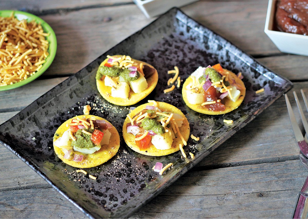 ஒரு தட்டில் ஆறு தட்டைகளை வரிசையாக வைத்து அதன் மேல் சிறிது உருளைக்கிழங்கு துண்டுகளை லேசாக மசித்தவாறு போடவும். பிறகு அதன்மேல் நறுக்கிய வெங்காயத்தைத் தூவவும். பின்னர் இதில் பூண்டுச் சட்னி, இனிப்புச் சட்னி, பச்சைச் சட்னி ஆகியவற்றை ஒன்றன் பின் ஒன்றாக ஊற்றவும். பிறகு சாட் மசாலா, வறுத்த சீரகத்தூள், மிளகாய்த்தூள், ஓமப்பொடி (சேவ்) மற்றும் கால் டீஸ்பூன் எலுமிச்சைச்சாறு ஆகியவற்றை பரவலாகச் சேர்க்கவும். இதன் மீது நறுக்கிய தக்காளி, மாங்காய், கொத்தமல்லி, வறுத்த கடலைப் பருப்பு தூவிப் பரிமாறவும். இதே போன்று மூன்று செட்டுகள் தயாரிக்கலாம்.