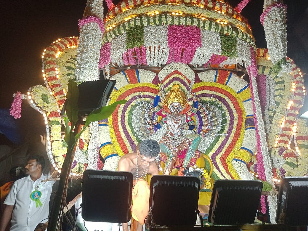 செங்கல்பட்டு: செங்கல்பட்டில் தசரா திருவிழாவின் 11-ஆம் நாளான வெள்ளிக் கிழமை அதிகாலை சாமிகள் புஷ்ப அலங்காரத்தில் ரதங்களில் ஊர்வலம் நடைபெற்றது.