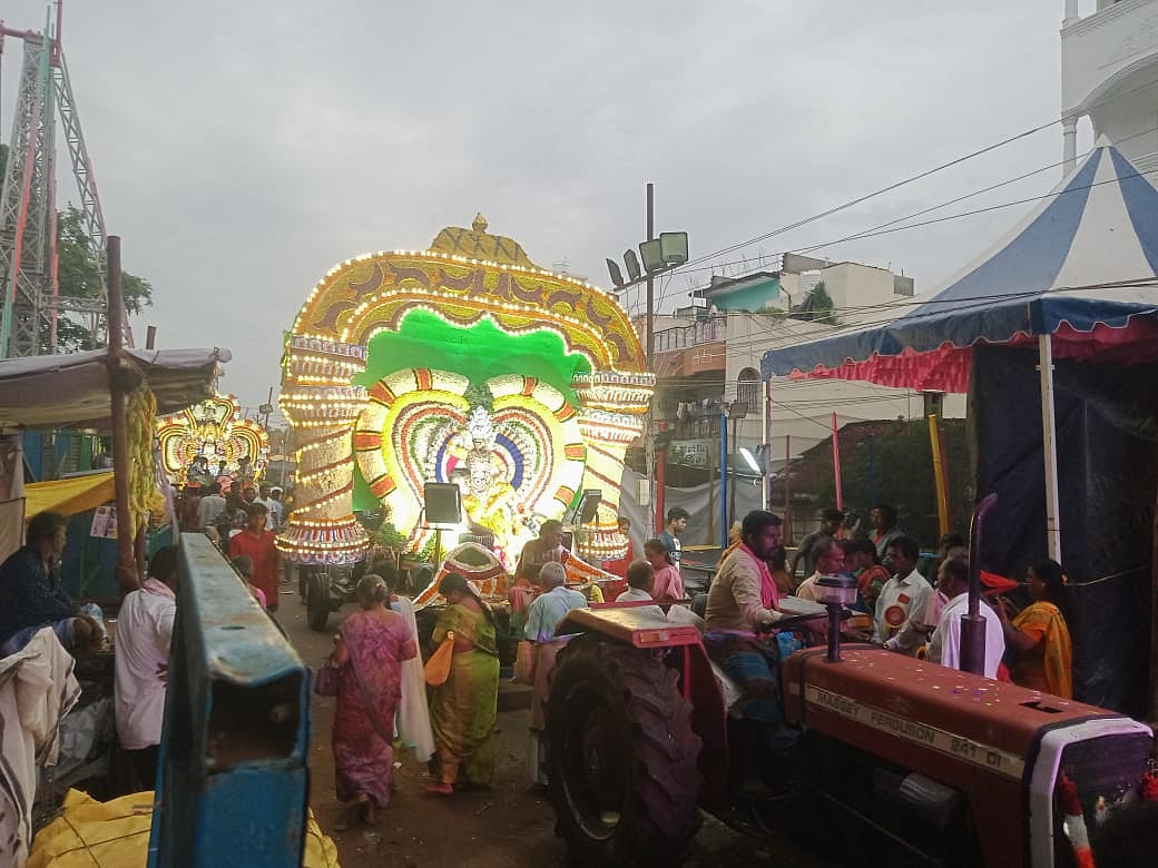 கோயில்களில் இருந்து ஜிஎஸ் ரோடு சாலை வழியாக அண்ணா சாலை, பஜார் வீதி வழியாக ஊர்வலமாக வந்து அனுமந்த புத்தேரி, அண்ணா சாலை முக்கூட்டில் வன்னி மரம் குத்தி வழியாக சாமி ஊர்வலம் சென்றது. சாமி ஊர்வலத்தை வரவேற்கும் விதமாக மேட்டுத்தெரு செங்கழுநீர் விநாயகர் கோயிலில் காமாட்சி அம்மன் அலங்காரத்தில் அருள் பாலித்தார். தொடர்ந்து அன்னதானம் வழங்கப்பட்டது.