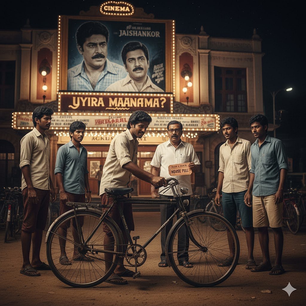 ஒரு வழியாக பட்டுக்கோட்டை நகரத்திற்குள் நுழைந்து, தியேட்டரை அடைந்தோம். அதற்குள்ளாக பத்துப் பதினைந்து நிமிடம் தாமதமாகி விட்டது. படம் ஓடிக் கொண்டிருக்கிறது. சைக்கிள்களைப் பார்க்கிங் லாட்டில் விட்டு விட்டுக் கவுண்டருக்கு ஓடினோம். கவுண்டர் க்ளர்க்கோ டிக்கட் முடிந்து விட்டதாகவும், கவுண்டரை மூடப் போவதாகவும் கூறி எங்களுக்கு ஷாக் கொடுத்தார்.
