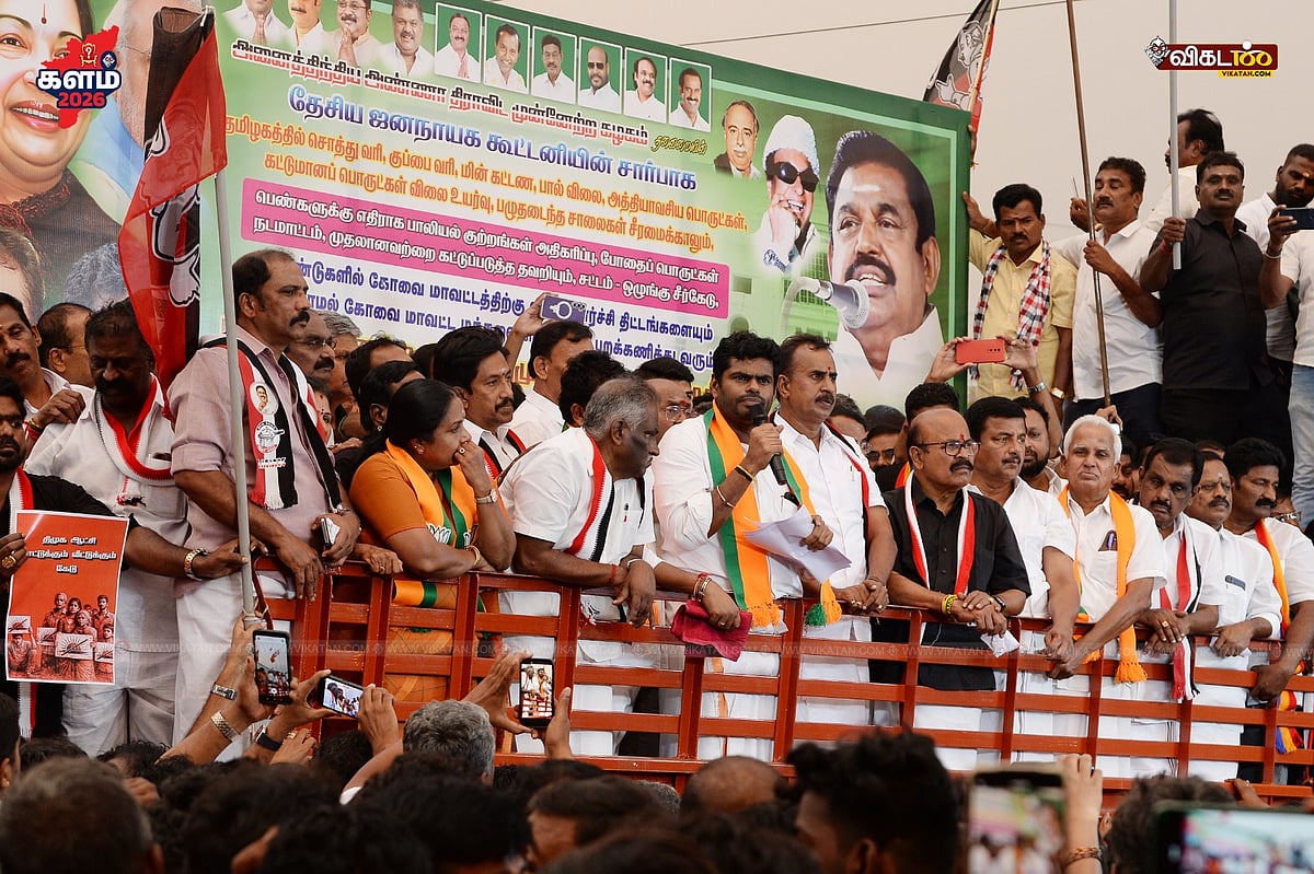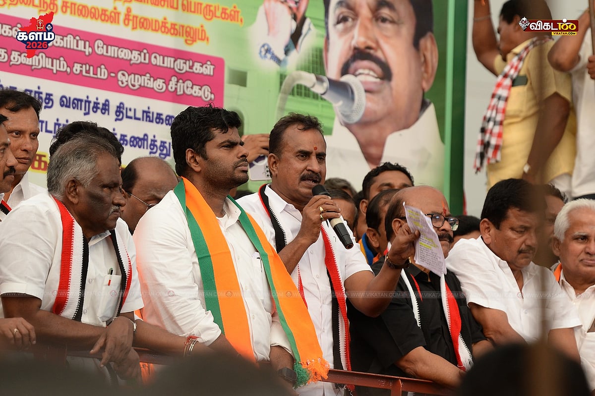 கடைசியாக பேசிய அண்ணாமலை, “ஸ்டாலின் ரீல்ஸ் முதலமைச்சராக மட்டுமே இருக்கிறார். வேறு எதிலும் அக்கறை காட்டுவதில்லை. கடந்த 5 ஆண்டுகளில் 1,495 கோடி மதுபாட்டில்கள் விற்கப்பட்டுள்ளன. பாட்டிலுக்கு 10 ரூபாய் வீதம் ரூ.14,950 கோடி பணத்தை செந்தில் பாலாஜி வசூல் செய்துள்ளார். தீய சக்தியை தூக்கி எறிய வேண்டும். இல்லையென்றால் தமிழகம் நம்மை மன்னிக்காது. அனைவரும் எடப்பாடி பழனிசாமி பின்னால் அணி வகுத்து செல்ல வேண்டிய கட்டாயம் இருக்கிறது” என்றார்.