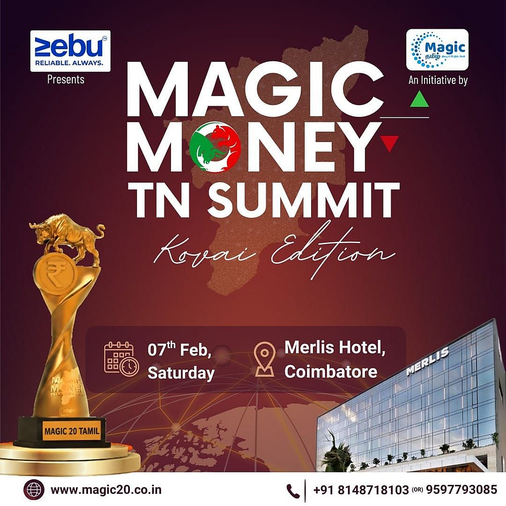 தங்கமும் வெள்ளியும் வரலாறு காணாத விலையேற்றம் கண்டுள்ளன. பங்குச் சந்தை ஏற்ற, இறக்கத்தில் உள்ளது. ரியல் எஸ்டேட் முதலீடு கணிக்க முடியாத ஒன்றாக உள்ளது. இந்த நிலையில் எந்த முதலீடு எதிர் காலத்தில் லாபத்தை அள்ளித்தரும் என்பதுதான் பலரது கேள்வியாக உள்ளது. இந்தக் குழப்பங்களுக்குத் தீர்வுதரும் நோக்கில் ‘Magic 20 Tamil’ நிறுவனம் ‘Magic Money TN Summit - Kovai Edition’ என்ற கருத்தரங்கை கோயம்புத்தூரில் நடத்த உள்ளது.