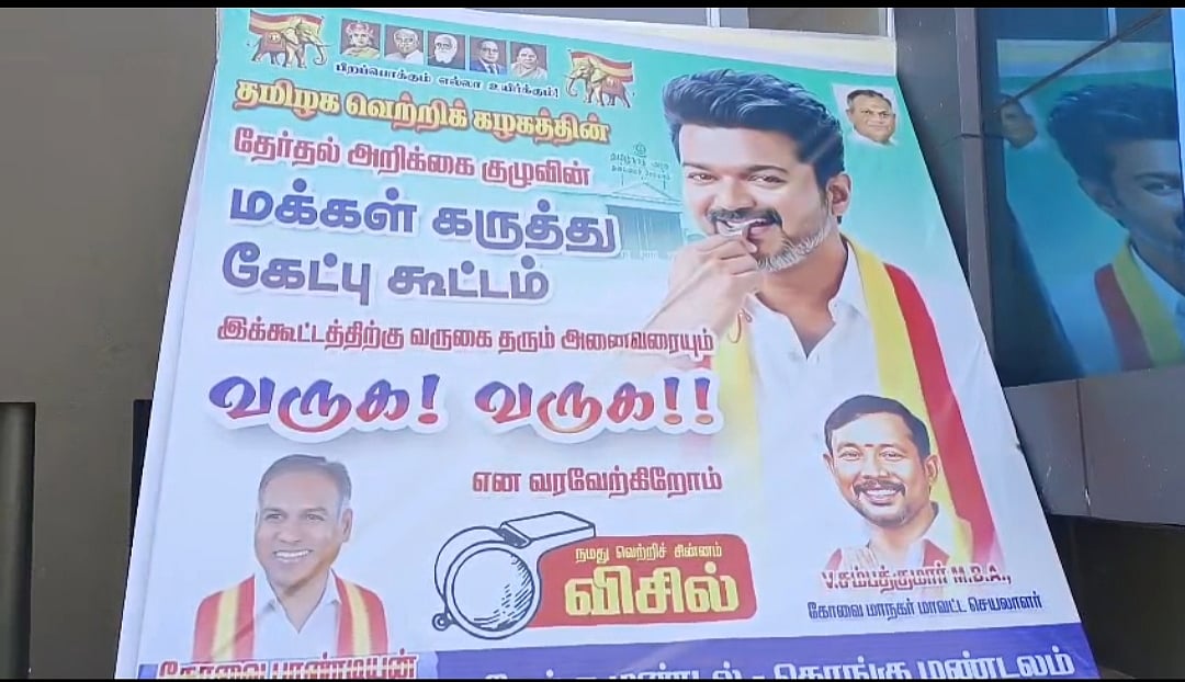தவெக தேர்தல் அறிக்கை தயாரிப்பு குழு ஒவ்வொரு மண்டலமாக பயணித்து மக்களின் கருத்துகளை கேட்டு வருகிறார்கள். அந்த வகையில் மேற்கு மண்டல மக்களின் கருத்து கேட்பு கூட்டம் கோவை கணியூர் பகுதியில் இன்று நடைபெற்றது. இந்த நிகழ்ச்சியில் தவெக நிர்வாகக் குழு தலைமை ஒருங்கிணைப்பாளரும், கொங்கு மண்டலத்தின் தவெக முக்கிய முகமான செங்கோட்டையன் பங்கேற்கவில்லை.