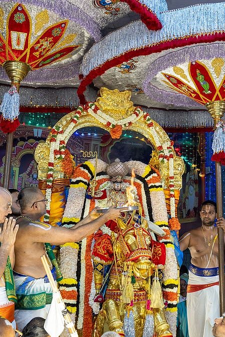 திருமலையில் கடந்த, 9 நாள்களாக நடந்த பிரம்மோற்சவம் முடிவடைந்ததை முன்னிட்டு வியாழக்கிழமை மாலை உற்சவமூா்த்திகள் தங்க பல்லக்கில் மாடவீதியில் வலம் வந்தனா். கொடிமரத்தில் ஏற்றப்பட்ட கருடக்கொடி இறக்கப்பட்டது. இதில் தேவஸ்தான அதிகாரிகள் கலந்து கொண்டனா்.