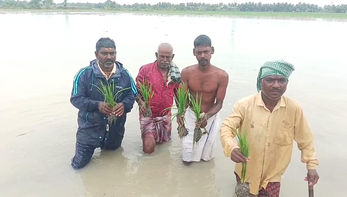 மழை நீர் சூழ்ந்த வயலில் விவசாயிகள்