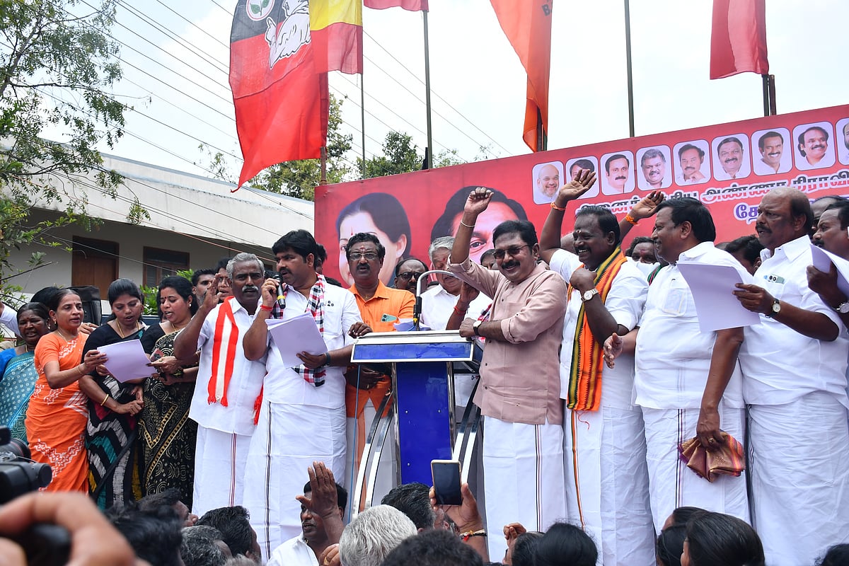 தஞ்சாவூரில், அதிமுக தலைமையிலான தேசிய ஜனநாயக கூட்டணிக் கட்சிகள் இணைந்து தமிழ்நாட்டில் நிலவும் பாலியல் கொடுமைகள், போதைப்பொருள்கள் புழக்கம் உள்ளிட்ட சட்டவிரோத செயல்களை தடுக்க தவறியதாக, திமுக அரசைக் கண்டித்து ஆர்ப்பாட்டம் நடத்தின. இதில் கலந்து கொண்ட அமமுக பொதுச் செயலாளர் டி.டி.வி.தினகரன் பேசியதாவது, ``2021ல் நாங்கள் பிரிந்து கிடந்தோம். நீங்கள் எளிதாக ஆட்சிக்கு வந்தீர்கள். இப்போது ஜெயலலிதாவின் பிள்ளைகள் ஓரணியில் திரண்டிருக்கிறோம். இன்னும் சொல்லப்போனால் ஜெயலலிதா ஆட்சி அமைய வேண்டும் என்பதற்காக அமமுக, அதிமுகவுடன் கரம் கோத்திருக்கிறது.