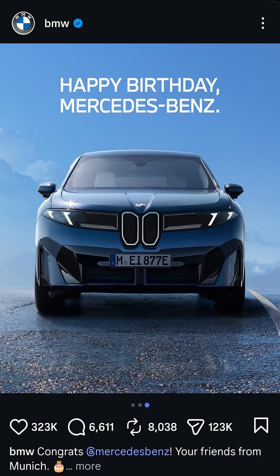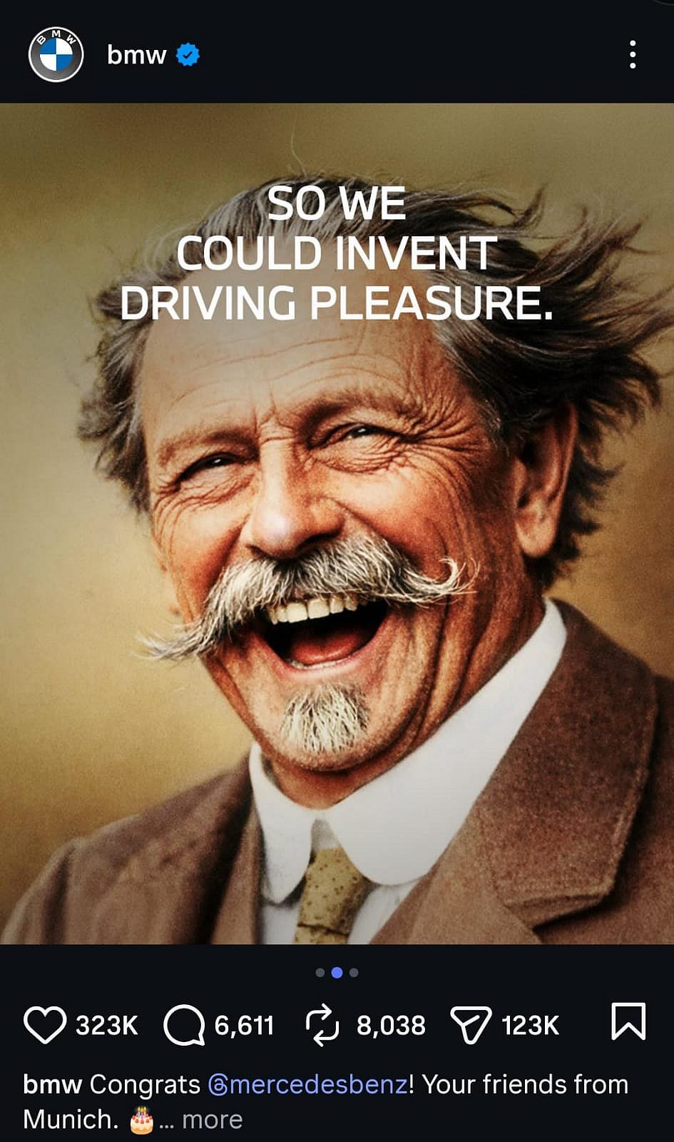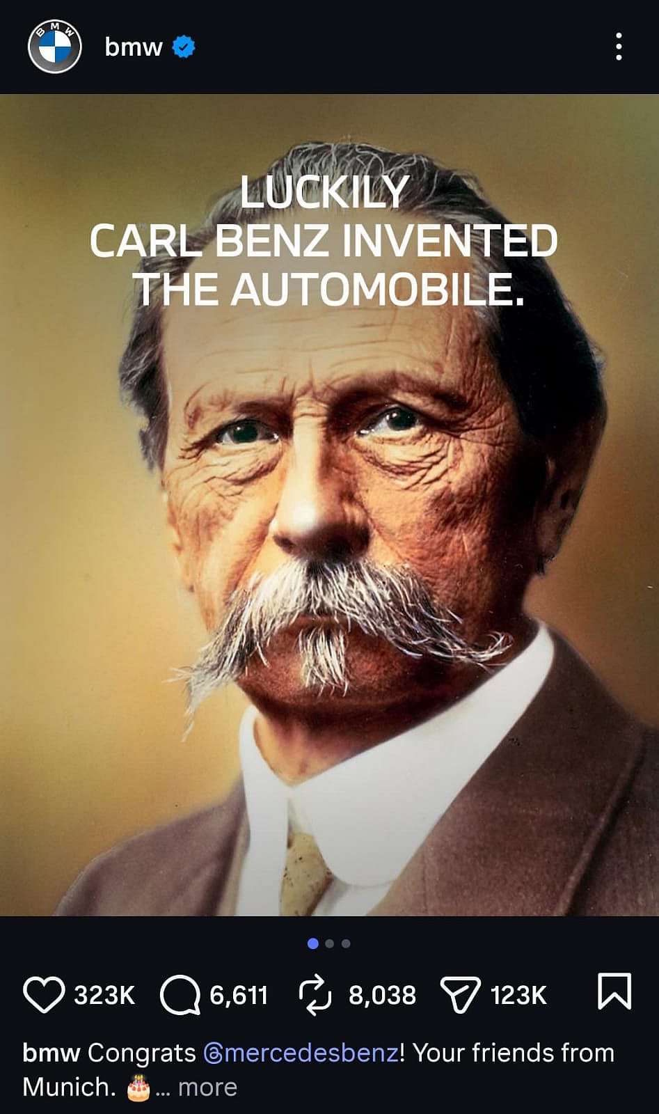 பிஎம்டபிள்யூ தனது இன்ஸ்டா பதிவில் முதல் படத்தில் கார்ல் பென்ஸின் புகைப்படத்தோடு “அதிர்ஷ்டவசமாக கார்ல் பென்ஸ் ஆட்டோமொபைலைக் கண்டுபிடித்துவிட்டார்.” எனும் வாசகமும், இரண்டாம் படத்தில் ”அதனால் நாங்கள் ஓட்டுநர் இன்பத்தைக் கண்டிபிடித்தோம்” எனும் வாசகமும் உள்ளது.