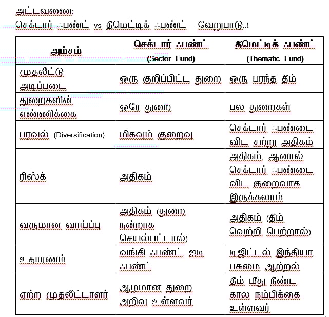 அதனால், செக்டார் ஃபண்டுகளை விட, தீமெட்டிக் ஃபண்டுகளில் சிறிதளவு அதிக பரவல் (Diversification) இருக்கும்