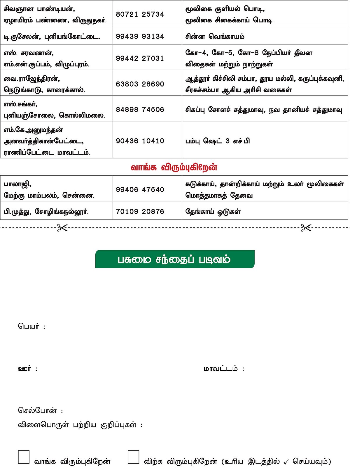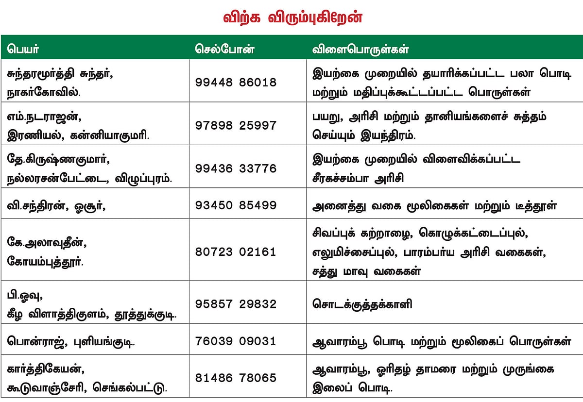 விவசாய விளைபொருள்கள், கால்நடைகள், மீன்கள், பண்ணை உபகரணங்கள் போன்றவற்றை இங்கே நீங்கள் சந்தைப்படுத்தலாம். இயற்கை இடுபொருள்களான உரம், பூச்சிவிரட்டி தொடர்பான தகவல்கள் மற்றும் நிலம் விற்பது, வாங்குவது தொடர்பான தகவல்கள் ஆகியவற்றைக் கண்டிப்பாகத் தவிர்க்கவும். விளைபொருள்களுக்குக் கட்டுப்படியான விலை கிடைக்க வேண்டும் என்ற உயரிய நோக்கில் உருவாக்கப்பட்டுள்ள இலவசப் பகுதி இது. இந்த இலவசப் பகுதியின் நோக்கம், விற்க விரும்பும் விவசாயிகள் மற்றும் வாங்க விரும்பும் வியாபாரிகள் இருதரப்புக்கும் இடையே தொடர்பை ஏற்படுத்தித் தருவதே. இதில் ‘பசுமை விகடன்’ வேறு எவ்விதத் தொடர்பும் வைத்துக்கொள்ளாது. பொருள்களின் தரம் மற்றும் விலை போன்றவற்றை வெளியிடங்களில் நன்கு உறுதிப்படுத்திக்கொண்டு வாங்குவது விற்பது போன்ற நடவடிக்கையை மேற்கொள்ளவும். சம்பந்தப்பட்ட நபருக்குப் பணத்தை வங்கியில் செலுத்துவதற்கு முன் பொருள் இருப்பையும் நபரின் முகவரியையும் உறுதி செய்துகொண்டு பணம் செலுத்துவது நல்லது. உங்கள் தகவல்களைக் கொடுக்கப்பட்டிருக்கும் படிவத்தில் எழுதி,
