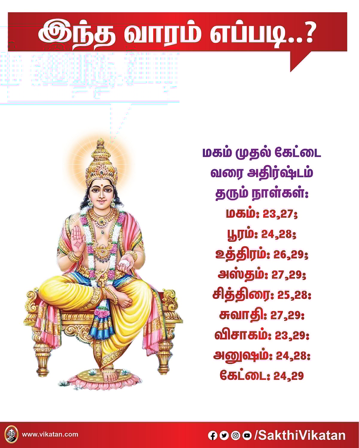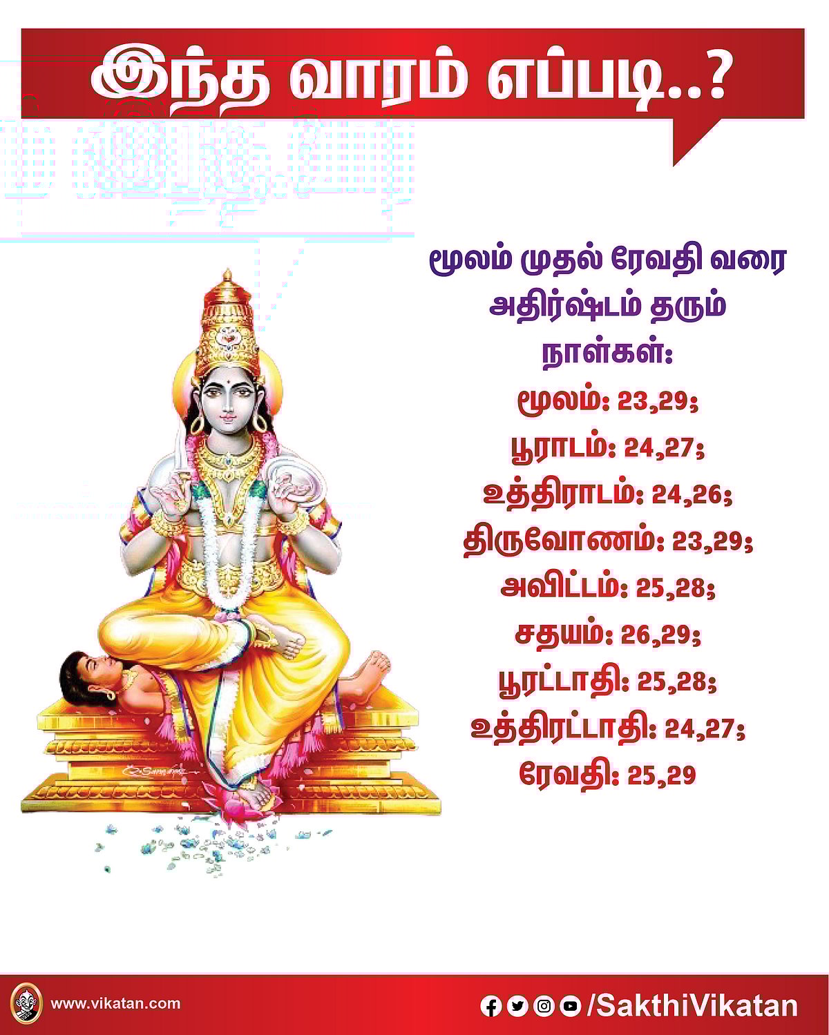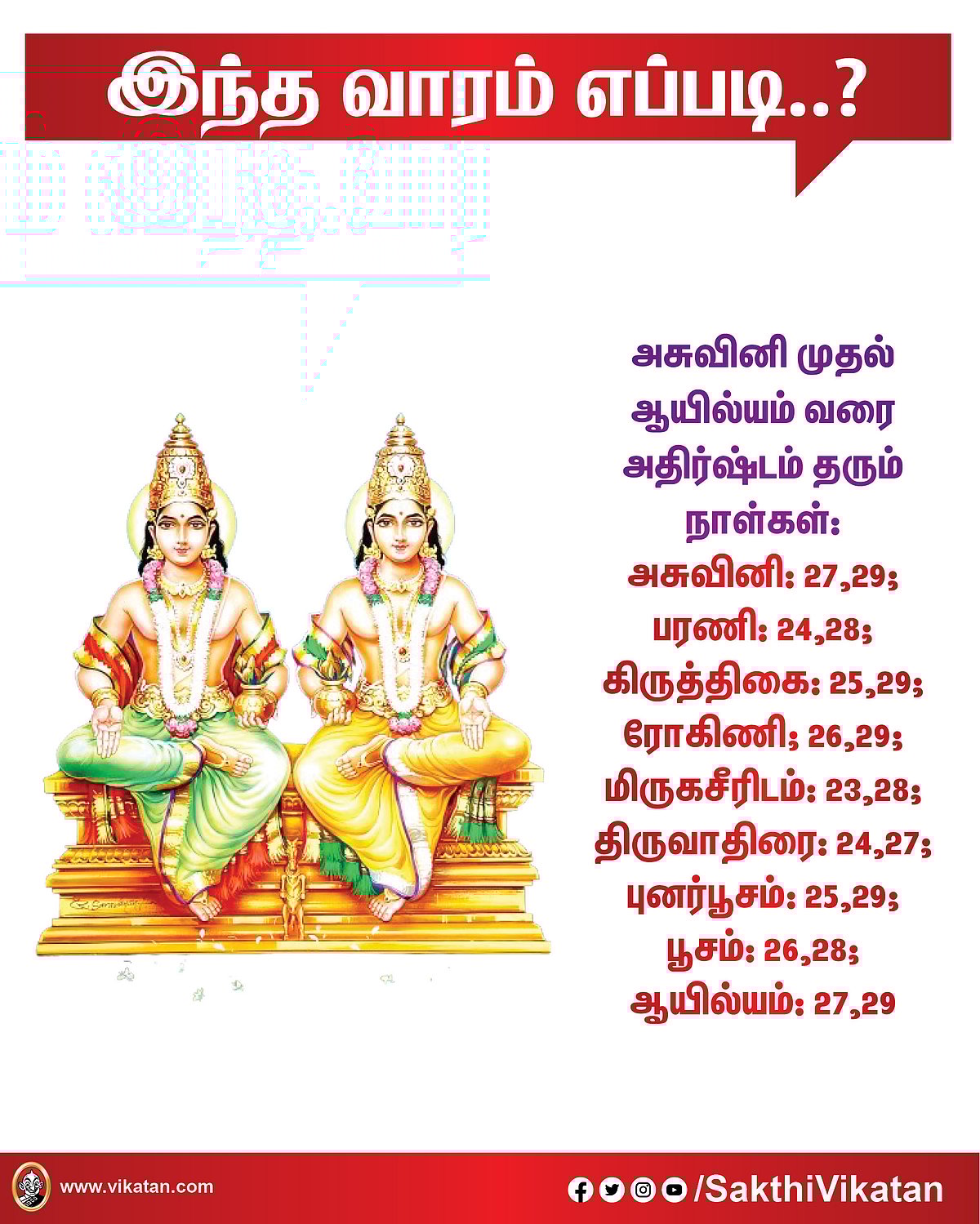 அசுவினிபரணி கிருத்திகை ரோகிணி மிருகசீரிடம்திருவாதிரை புனர்பூசம் பூசம் ஆயில்யம் மகம் பூரம் உத்திரம் அஸ்தம் சித்திரை சுவாதி விசாகம் அனுஷம் கேட்டை மூலம் பூராடம் உத்திராடம் திருவோணம் அவிட்டம் சதயம் பூரட்ட... மேலும் பார்க்க