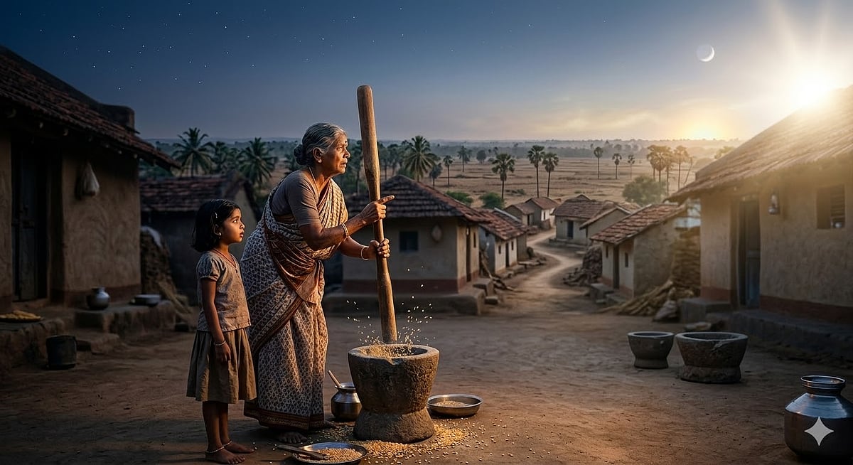 அந்த நேரத்திலேயே உரல்லே சோளத்தப் போட்டு உலக்கையாலே மல்லுக்கட்டிகிட்டிருந்தா நம்ம லட்சுமியம்மா. உலக்கையை ரெண்டு கையிலும் சேர்த்துப் பிடிச்சு கொஞ்சநேரம் கைகளை மாத்தி மாத்தி உயரப் போட்டு கொஞ்ச நேரம்ன்னு சோளங்குத்தி முடிக்கப் போற சமயத்துலே பளீர்னு கண்ணைக் கூசற மாதிரி ஒரு வெளிச்சம். சந்திரனும் சூரியனும் கூட தன்னை மறந்து திரும்பிப் பார்த்தாங்க.