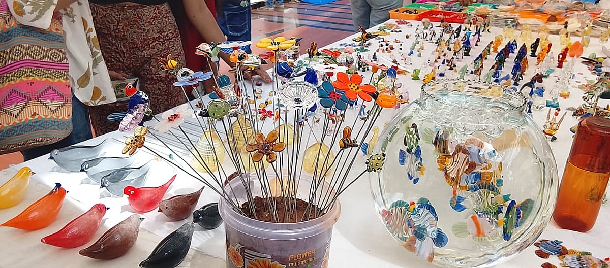 வண்ணமயமான கண்ணாடிப் பூக்கள், பறவைகள் என குழந்தைகள் பேவரேட் லிஸ்ட் ஒருபுறமும், தெய்யம், நாட்டார் கலை வடிவங்கள் என கண்காட்சியில் ஒவ்வொன்றும் நம்மை ஈர்க்கின்றன.
