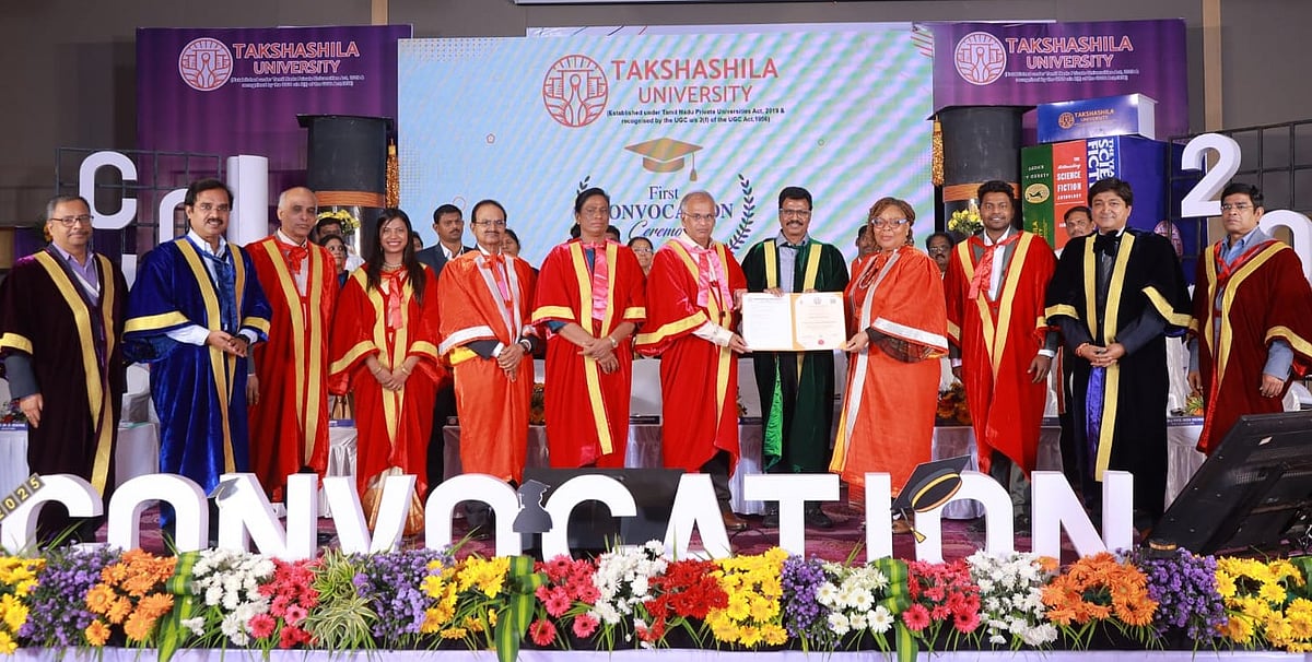 இதுகுறித்துப் பேசிய பல்கலைக்கழகத்தின் பதிவாளர் டாக்டர் செந்தில், ``எங்கள் ஸ்ரீமணக்குள விநாயகர் கல்வி அறக்கட்டளை சார்பில் கடந்த ஆண்டு தட்சசீலா பல்கலைக்கழகம் துவங்கப்பட்டது. அதன் முதலாவது பட்டமளிப்பு விழாவில் முக்கியமான இருவருக்கு கௌரவ டாக்டர் பட்டங்கள் அளிக்க முடிவு செய்தோம்.
