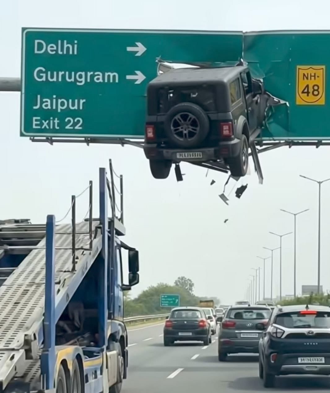 மஹிந்திரா தார் ஜீப் ஒன்று, ஒரு தேசிய நெடுஞ்சாலையின் மீதுள்ள ஓவர்ஹெட் சைன் போர்டில் குத்திக் கிழித்துக் கொண்டு அந்தரத்தில் நிற்கிறது. ஆனால் விபத்து பற்றி எந்த ஒரு மீடியாக்களிலும் வராதபட்சத்தில், சோஷியல் மீடியாக்களில் மட்டும் இது வைரலானது எப்படி?