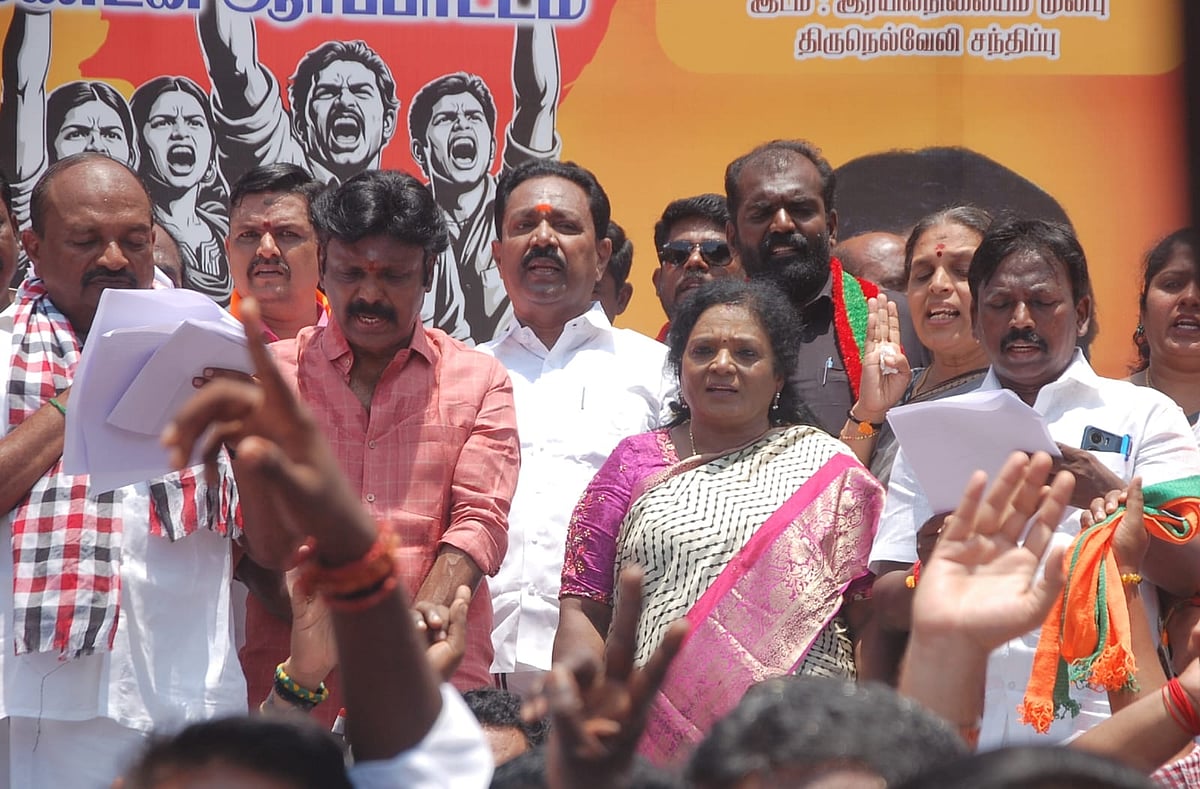 சட்டம்-ஒழுங்கு பிரச்னையால் தமிழ்நாடு மிகவும் பாதிக்கப்பட்டுள்ளதைக் கண்டித்தும் பெண்களுக்கு எதிரான வன்கொடுமைகள் அதிகரித்து வருவதை கண்டித்தும் அதிமுக மற்றும் தேசிய ஜனநாயக கூட்டணி சார்பில் நெல்லை சந்திப்பு ரயில் நிலையம் முன்பு ஆர்ப்பாட்டம் நடைபெற்றது. அ.தி.மு.க., பா.ஜ.க உள்ளிட்ட தேசிய ஜனநாயகக் கூட்டணிக் கட்சிகளின் சார்பாக நடந்த ஆர்ப்பாட்டத்தில் பா.ஜ.க முன்னாள் மாநிலத் தலைவர் தமிழிசை சௌந்தர்ராஜன் கலந்துகொண்டு பேசினார்.