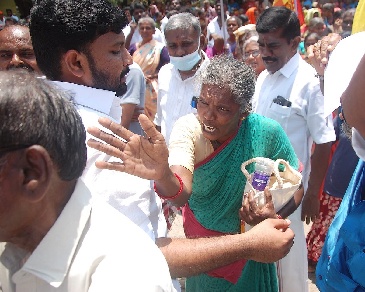 அப்போது கூட்டத்தில் நின்று கொண்டிருந்த மூதாட்டி ஒருவர் சத்தமாக, "யம்மா ஒரு நிமிஷம்... தமிழ்நாட்டு இளைஞர்களுக்கு வேலை எங்கே? சென்ட்ரல் கவெர்மென்ட் வேலை எங்கே?" என்று தமிழிசையை நோக்கி கேள்வி எழுப்பினார். அதைக் கேட்காததுபோல தமிழிசை சௌந்தர்ராஜன் தொடர்ந்து பேசிக் கொண்டிருந்தார். ஆனால் அந்தப் பெண்மணி விடாமல் கேள்வி கேட்டுக் கொண்டே இருந்ததால், ஆர்ப்பாட்டத்தில் பங்கேற்ற பலரது கவனமும் அவர் பக்கமாகத் திரும்பியது. அப்போது அங்கே நின்றுகொண்டிருந்த அ.தி.மு.க ஆண் நிர்வாகிகள் சிலர், அந்த மூதாட்டியை கூட்டத்தை விட்டு அப்புறப்படுத்தும் நோக்கத்தில் தள்ளினார்கள். ஆனால் அவரோ விடாமல் தனது கேள்வியை தமிழிசை நோக்கி முன்வைத்தார்.