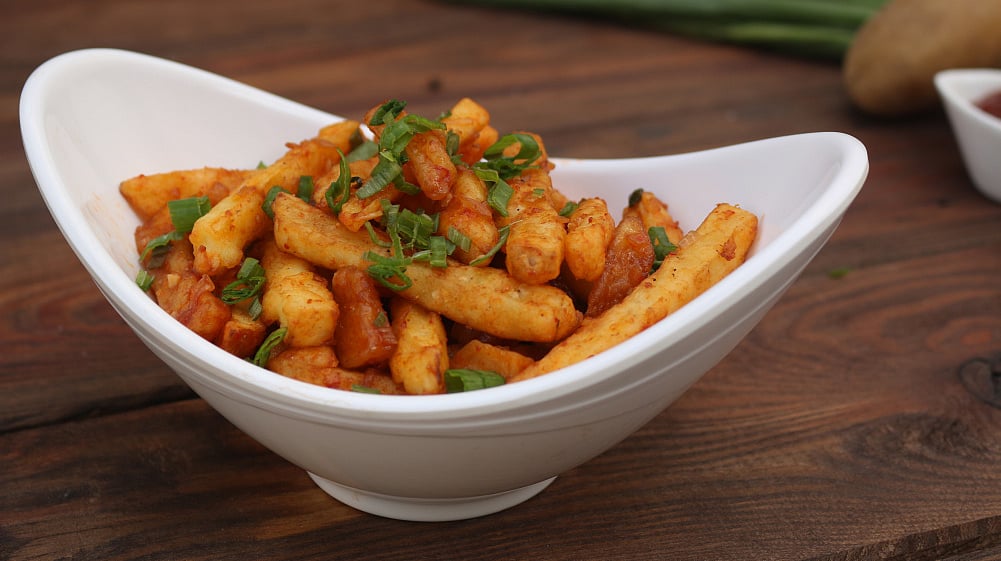 ஒரு பானில் எண்ணெய்விட்டு சூடாக்கி பொடியாக நறுக்கிய இஞ்சி, வெங்காயம், பூண்டு, பச்சை மிளகாய் மற்றும் குடமிளகாய் சேர்த்து நன்கு வதக்கவும். பிறகு இதில் தக்காளி கெட்சப், சோயா சாஸ், வினிகர், கரம் மசாலாத்தூள், மிளகாய்த்தூள், உப்பு, சிறிது தண்ணீர் ஆகியவற்றைச் சேர்க்கவும். கலவையைப் பச்சை வாசனை போகக் கொதிக்கவிடவும். ஒரு டீஸ்பூன் சோள மாவை தனியாக எடுத்து அதனுடன் சிறிது தண்ணீர் சேர்த்துக் கலந்து அதைக் கொதிக்கும் இந்தக் கலவையில் சேர்த்துக் கிளறவும். பின்னர் பொரித்து வைத்துள்ள உருளை துண்டுகளை இதனுடன் சேர்த்து நன்கு கிளறி இறக்கவும். வெங்காயத்தாள் தூவி சூடாகப் பரிமாறவும்.