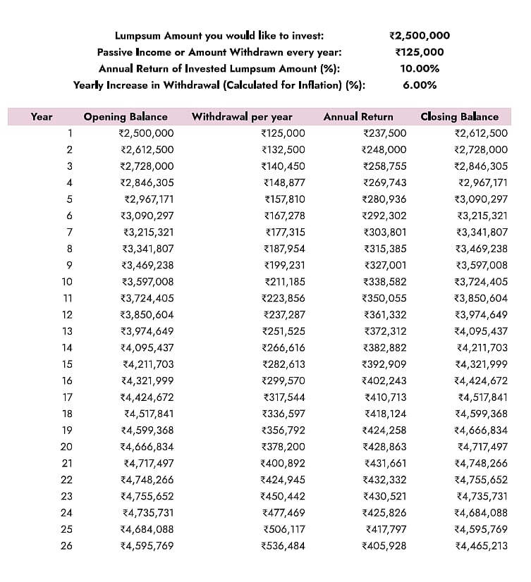 மாதாந்திர வருமானம் (SWP): ₹ 10,417 (ஆண்டுக்கு 4%)