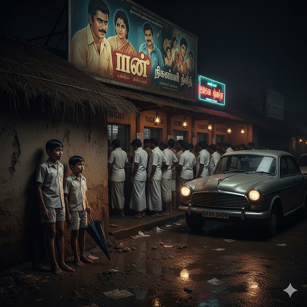 மனதில் ‘நான்’கொடுத்த உற்சாகம், அதையெல்லாம் பொருட்படுத்தவில்லை.9.30 மணிக்குள்ளாகத் தியேட்டரை அடைந்து விட்டோம்.மழை மட்டும் விட்ட பாடில்லை.அங்கு வந்த பிறகுதான் அடுத்த ஷாக் காத்திருந்தது.எங்கள் ஊர் பண்ணையாரான எங்கள்