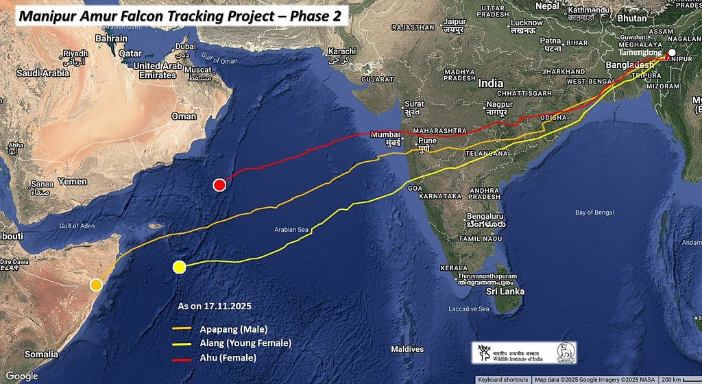And the epic journey begins again in all its glory. Three new travellers, Apapang (adult male) orange track, Alang (young female) Yellow track, and Ahu (adult female) Red Track, were satellite-tagged on 11th November 2025 as part of the Manipur Amur Falcon Tracking Project (Phase… pic.twitter.com/07Z6wUvz2Y