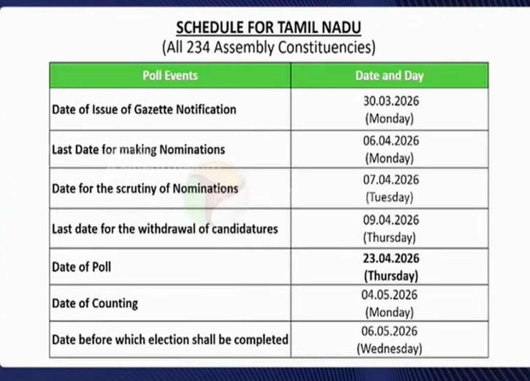 டெல்லி விஞ்ஞான் பவனில் தலைமை தேர்தல் ஆணையர் ஞானேஷ் குமார் தேர்தல் தேதி தொடர்பாக, "மேற்கு வங்கம், அசாம், தமிழ்நாடு, கேரளா மற்றும் புதுச்சேரி ஆகிய பகுதிகளில் மொத்தம் 17.4 கோடி வாக்காளர்கள் தங்கள் வாக்குகளைப் பதிவு செய்வார்கள். நீங்கள் வாழ்வில் மிக முக்கியமான பொறுப்புகளில் ஒன்றை ஏற்கத் தயாராக இருக்கிறீர்கள். உங்கள் வாக்கு, நீங்கள் தேர்ந்தெடுக்கும் எதிர்காலம்.