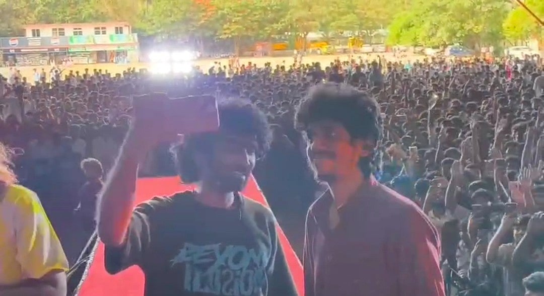அங்கிருந்து புறப்படுவதற்கு முன்பு பிரதீப் மற்றும் கீர்த்திஸ்வரன் மேடையில் நின்றபடி, அங்கு திரண்டிருந்த மாணவர்களுடன் செல்ஃபி எடுத்துள்ளார். அப்போது சுற்றி நின்ற மாணவர்கள் தங்களின் செல்போன்களை பிரதீப்பிடம் கொடுத்து எடுக்க முயற்சித்துள்ளனர்.