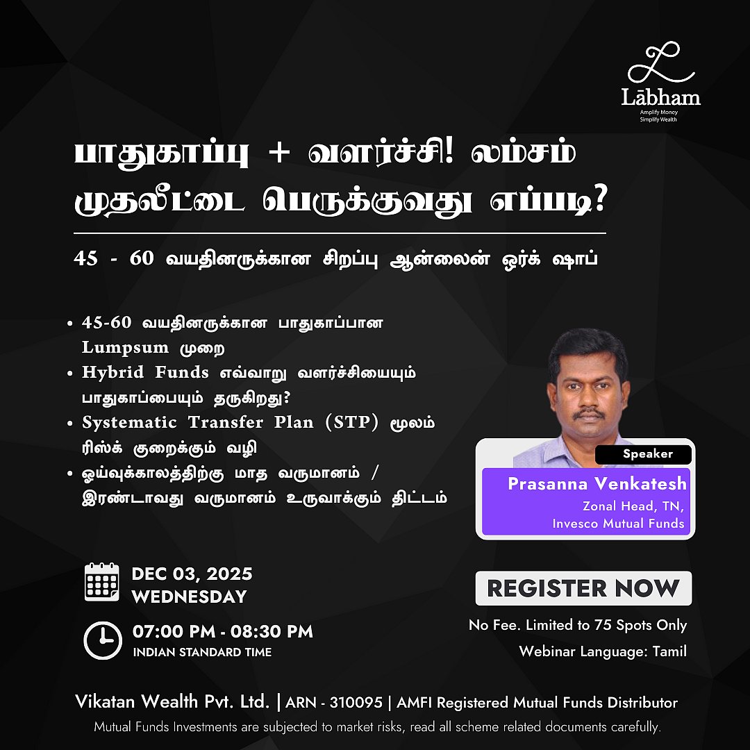 "இது எல்லாம் புரிகிறது. ஆனால் நான் எங்கே ஆரம்பிப்பது? என் 10 லட்சத்தை எந்த fund-ல் போடுவது? எவ்வளவு ரிஸ்க் எடுக்கலாம்?" – இந்தக் கேள்விகளுக்கெல்லாம் பதில் கிடைக்க, 'பாதுகாப்பு + வளர்ச்சி! லம்சம் முதலீட்டைப் பெருக்குவது எப்படி? 45 - 60 வயதினருக்கான வழிகாட்டல்' என்ற சிறப்பு ஆன்லைன் ஒர்க் ஷாப்பில் கலந்துகொள்ளுங்கள்.