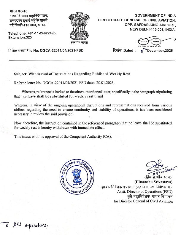 குறிப்பாக விமானிகளுக்கு கூடுதல் ஓய்வு நேரம், வாரத்தில் 2 நாட்கள் கட்டாய விடுப்பு உள்ளிட்ட பல்வேறு விதிகளால் இண்டிகோ விமான சேவைகள் கடுமையாக பாதிக்கப்பட்டதாகக் கூறப்பட்டது.
