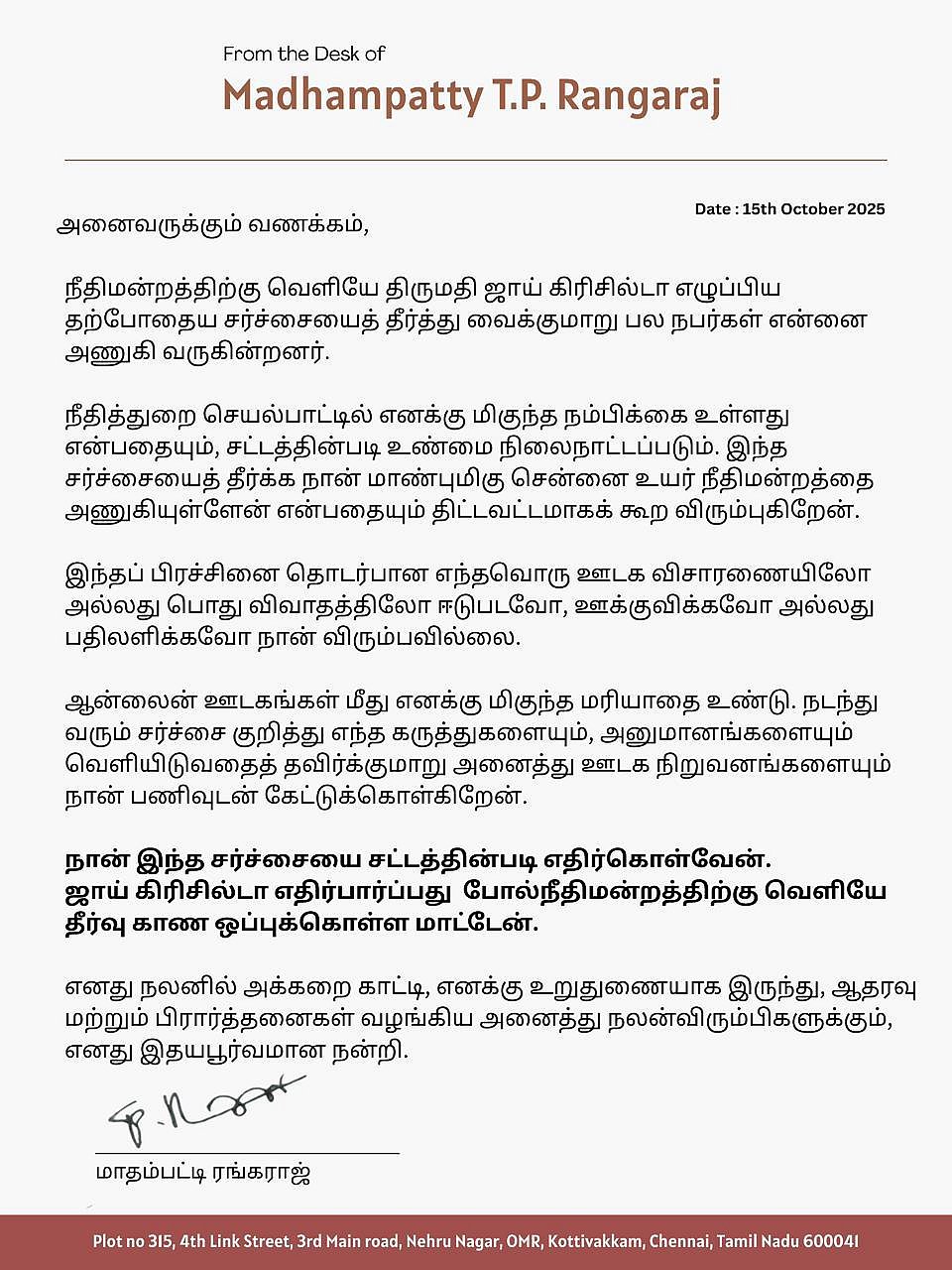 அவர், ``நீதிமன்றத்திற்கு வெளியே திருமதி ஜாய் கிரிஸ்டில்டா எழுப்பிய தற்போதைய சர்ச்சையைத் தீர்த்து வைக்குமாறு பல நபர்கள் என்னை அணுகி வருகின்றனர்.