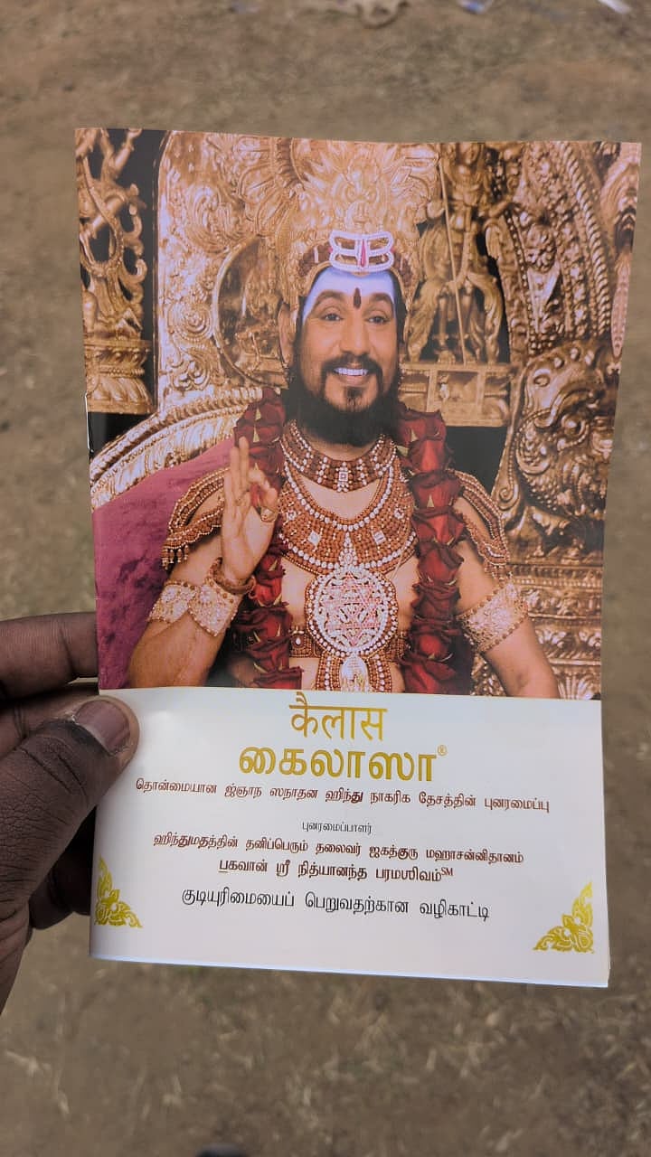 NDA பொதுக்கூட்டத்தில் நித்தியானந்தாவின் சீடர்கள் கைலாசாவுக்கு செல்வதற்கான வழிகாட்டு நெறிமுறைகள் அடங்கிய புத்தகத்தை விநியோகித்து வருகின்றனர்.