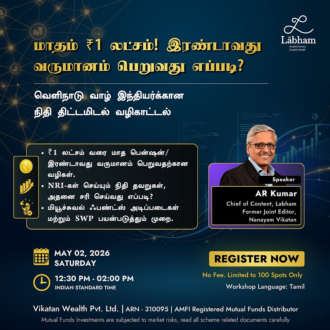 மியூச்சுவல் ஃபண்ட்ஸ் விநியோக நிறுவனமான லாபம் வழங்கும் இந்தப் பிரத்யேக ஆன்லைன் பயிலரங்கில், NRI-களுக்கான சரியான SWP உத்திகள், வரிச் சலுகைகள் மற்றும் மூலதனத்தைக் கரையாமல் பாதுகாக்கும் ரகசியங்களை நேரடியாகக் கற்றுக்கொள்ளலாம். உங்களின் நிம்மதியான எதிர்காலத்தை இன்றே உறுதி செய்ய பெயரை முன்பதிவு செய்யுங்கள். குறைந்த இடங்கள் மட்டுமே, முன்பதிவு கட்டாயம்: https://labham.money/events/webinar-may02-2026?utm_source=vikatan_com&utm_medium=article&utm_campaign=webinar_may02_2026