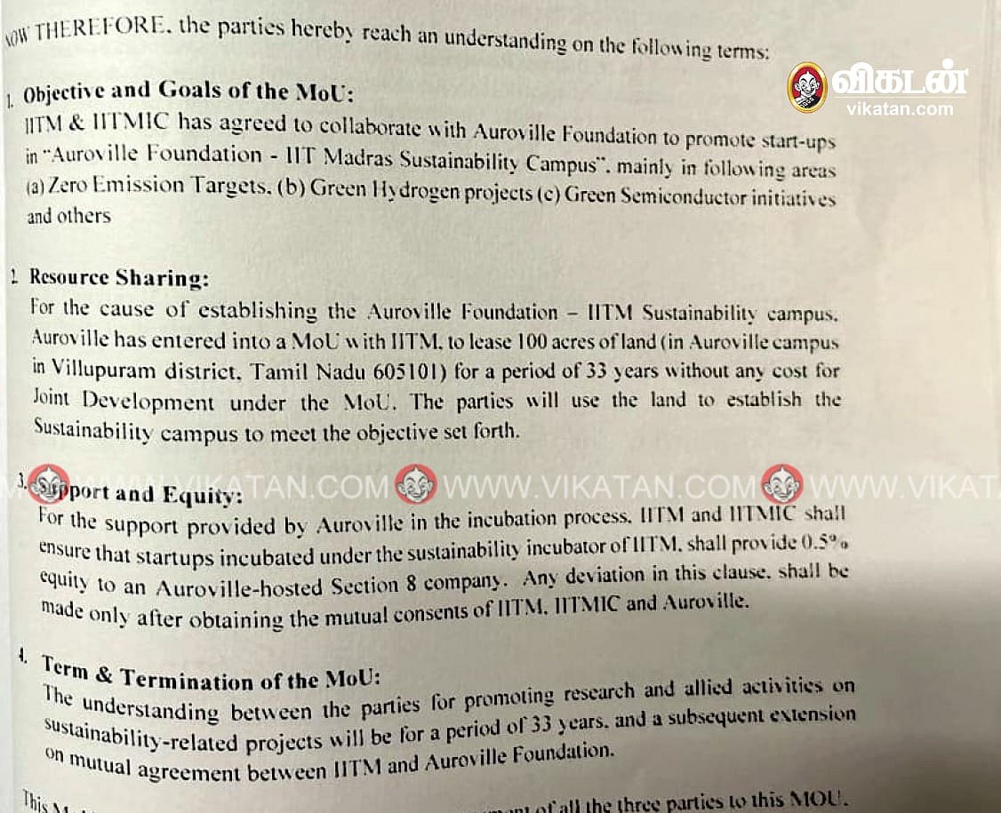 ஆரோவில் ஃபவுண்டேஷன் - சென்னை ஐ.ஐ.டி-க்கு இடையேயான ஒப்பந்தத்தை `ரகசிய ஒப்பந்தம்’ (confidentiality clause) என்று கூறி, தற்போது வரை அது வெளியிடப்படவில்லை. ஆனால், நமக்கு எக்ஸ்க்ளூசிவாகக் கிடைத்துள்ள, சென்னை ஐ.ஐ.டி-யின் இயக்குநர் வீழிநாதன் காமகோடியும், ஆரோவில் ஃபவுண்டேஷன் செயலாளர் ஜெயந்தி ரவியும் கையெழுத்து போட்ட அந்த ஒப்பந்தத்தின் ஒருசில முக்கியப் பகுதிகளை மட்டுமே இங்கே கொடுக்கிறோம்.