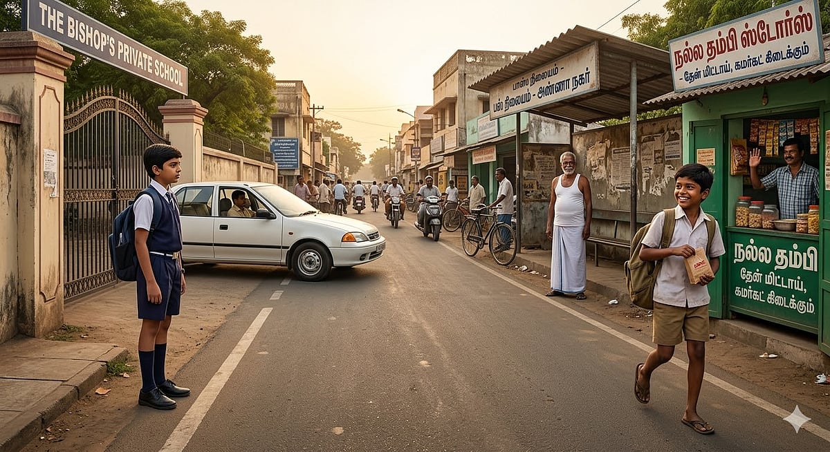 அந்த சிறுவன் பாடப்புத்தகப்பையை முதுகில் தாங்கியபடி ஆடிக்கொண்டே வந்தான். தோற்றத்தில் ஏழ்மை தெரிந்தாலும் முகத்தில் நடையில் சந்தோக்ஷத்துள்ளல் தெரிந்தது. சுற்றுமுற்றும் ரோட்டைச் துளாவிய அவனது தேடல் அருகில் இருந்த பெட்டிக்கடையில் நின்றது.