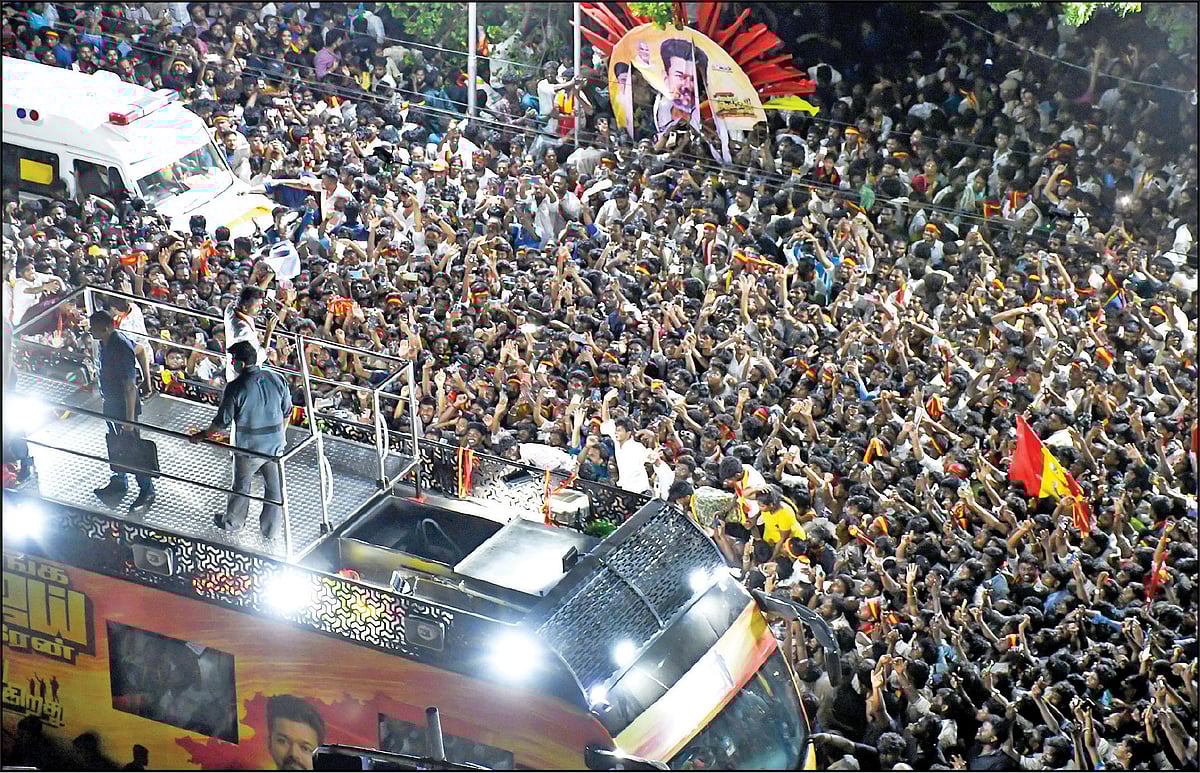 ஆனால் அதற்கு நேர் மாறாக இந்த கட்சியினுடைய நிகழ்ச்சி நடந்துள்ளது. கரூர் மாவட்ட எல்லை தவிட்டுபாளையம் சோதனை சாவடி நிகழ்ச்சிக்கு பின் கேரவன் வாகனத்தை பின்தொடர்ந்து பெருவாரியான ரசிகர்களுடன் கட்சியினரும் நிகழ்ச்சி நடைபெறும் இடத்துக்கு வந்துகொண்டிருந்தார். நிகழ்ச்சி நடைபெறும் பகுதிக்கு பிரச்சார வாகனம் வரும்போது அதிகப்படியான கூட்டம் இருந்ததாலும், கரூர் நகர உட்கோட்ட காவல்துறை கண்காணிப்பாளர் அவர்கள் பிரச்சார வாகனத்தில் இருந்த ஏற்பாட்டாளர்களை அக்ஷயா மருத்துவமனை அருகே நிறுத்தி கூட்டத்தில் உரையாற்றுமாறு அறிவுறுத்தி இருக்கிறார்கள்.