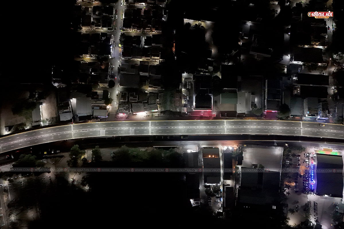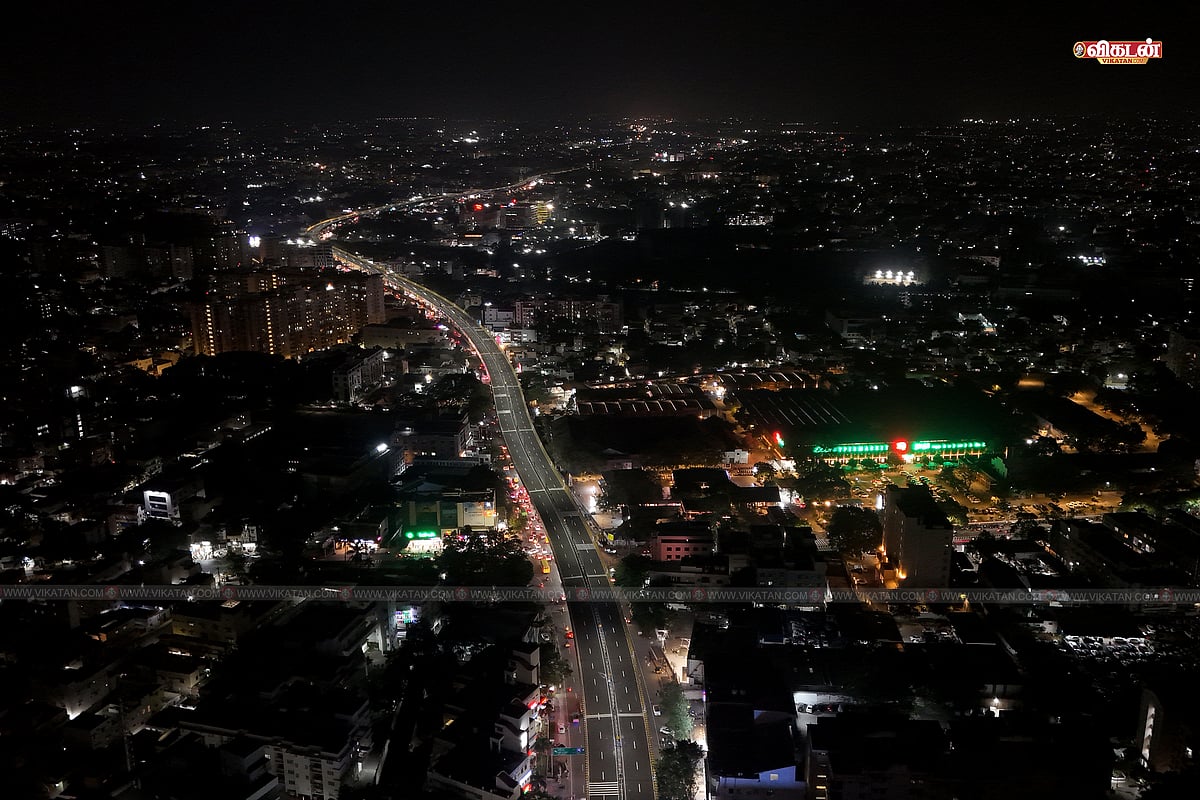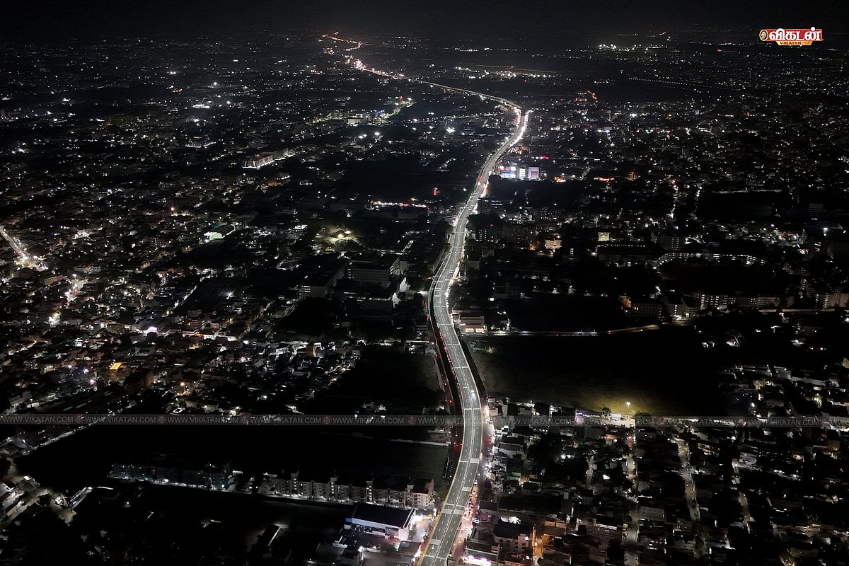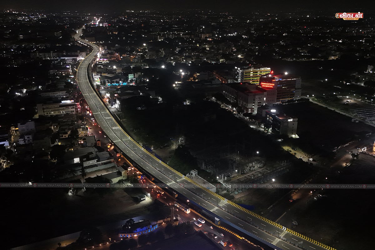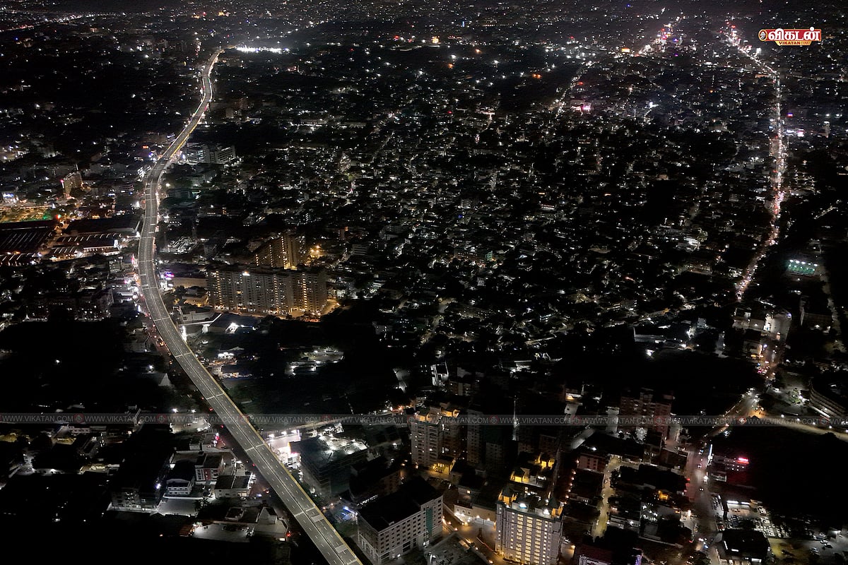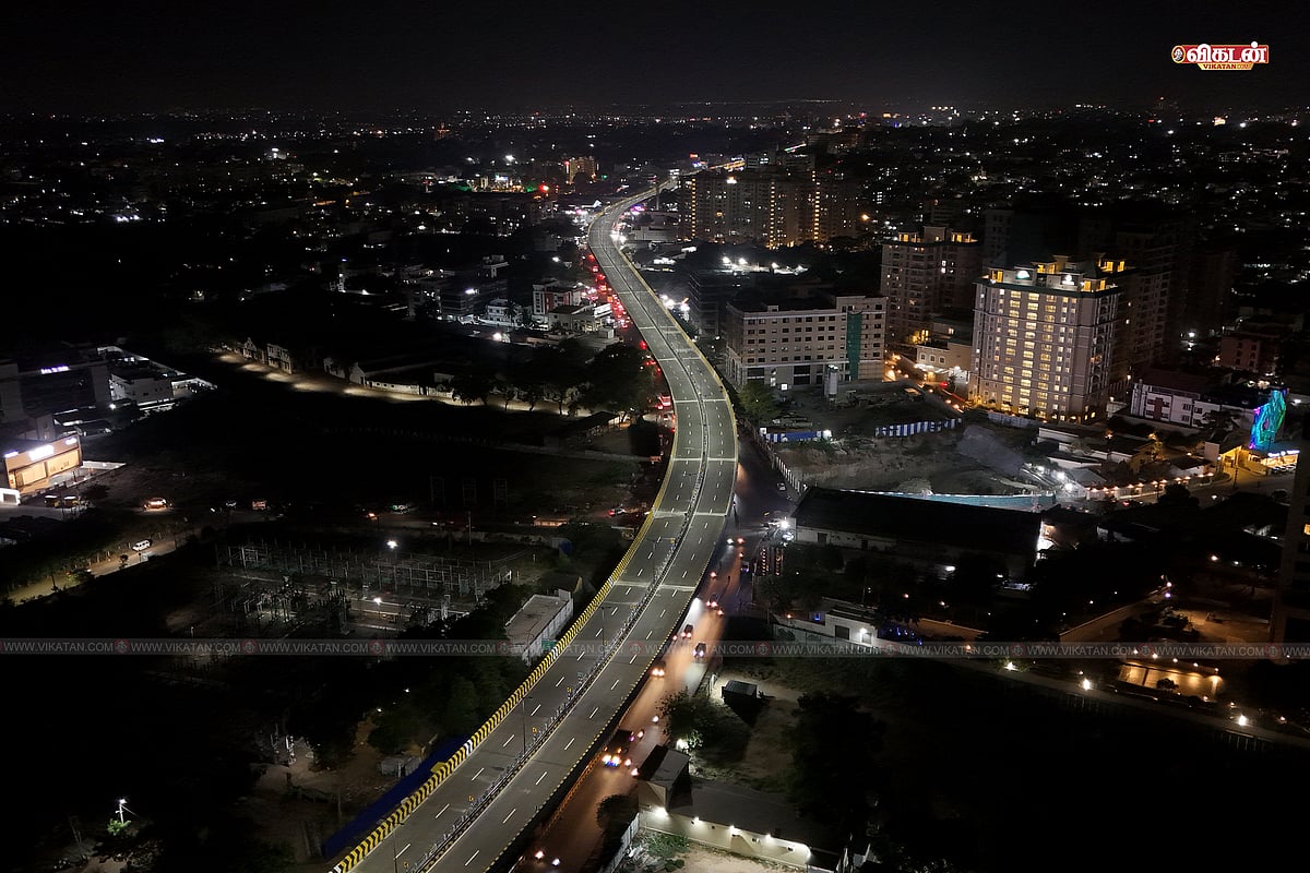 கோவை: இரவின் மின்னொளியில் 10.1 கி.மீ நீளமுள்ள புதிய ஜி.டி. நாயுடு மேம்பாலம் | Exclusive Drone Shots