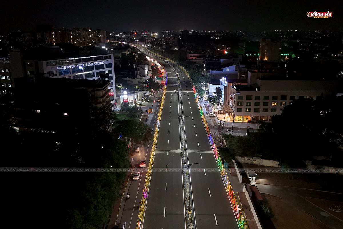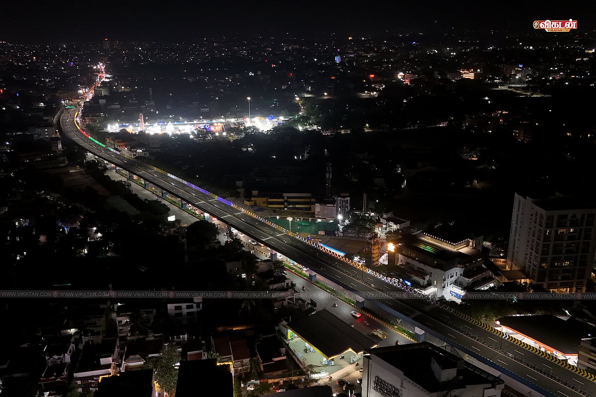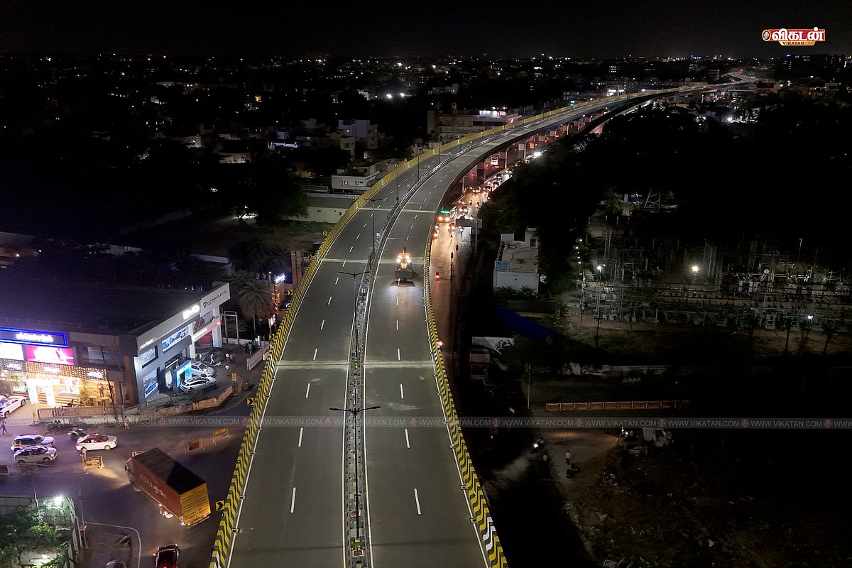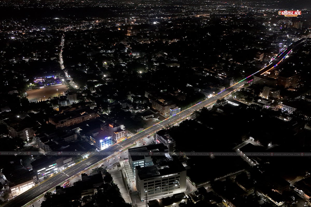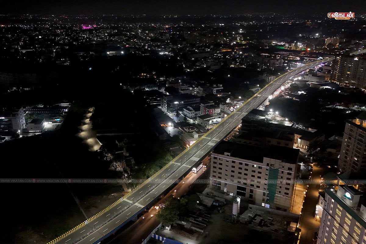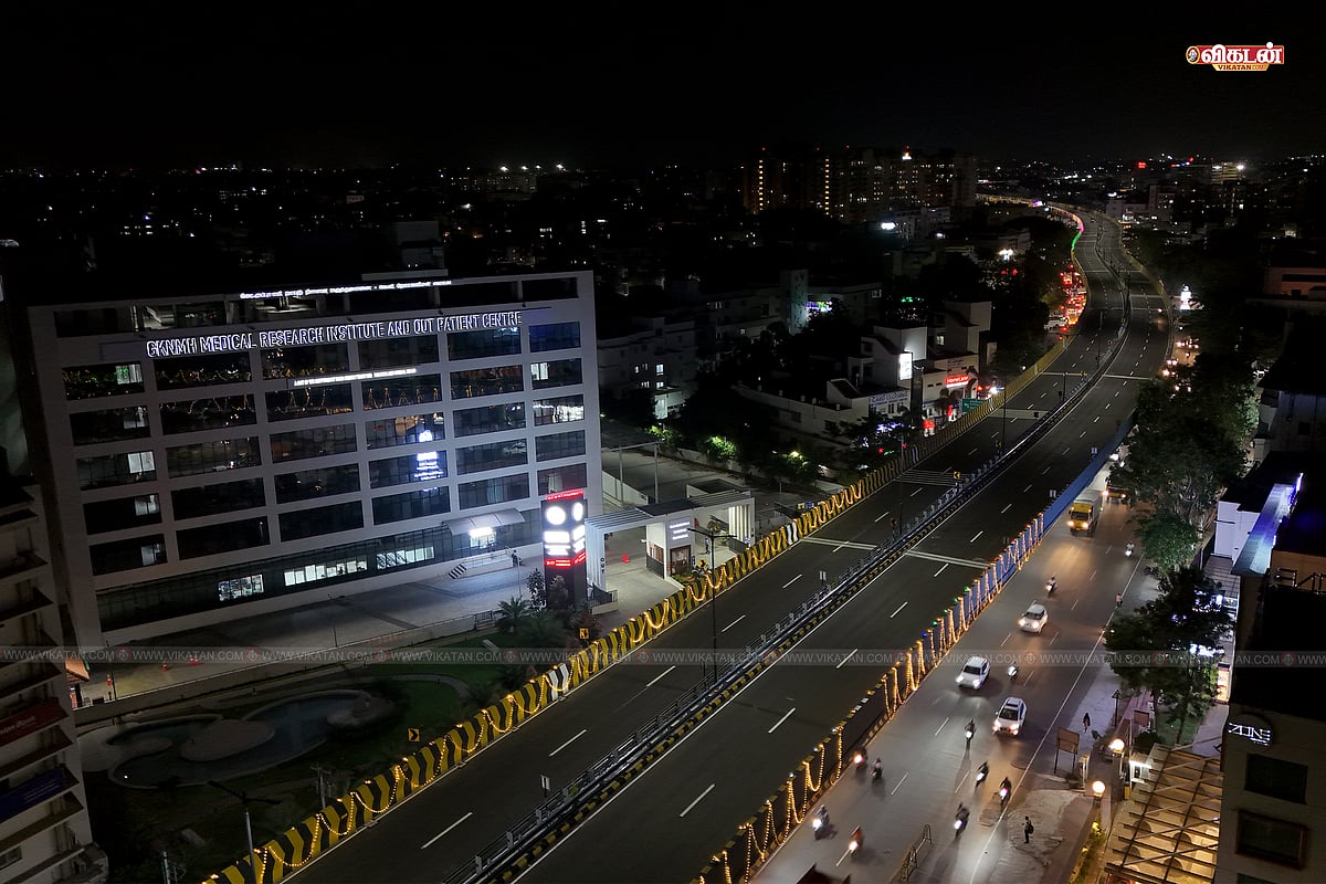 கோவை: இரவின் மின்னொளியில் 10.1 கி.மீ நீளமுள்ள புதிய ஜி.டி. நாயுடு மேம்பாலம் | Exclusive Drone Shots