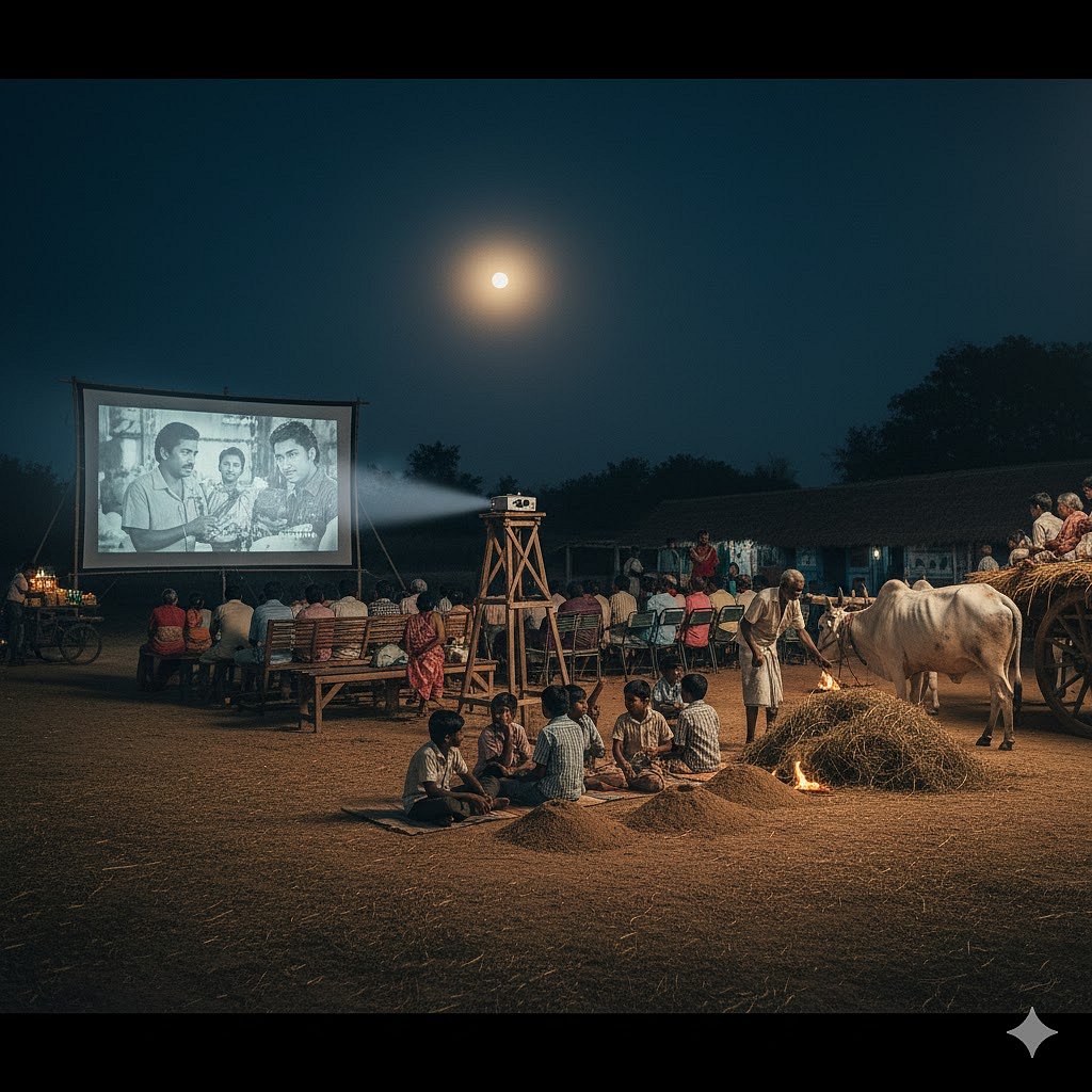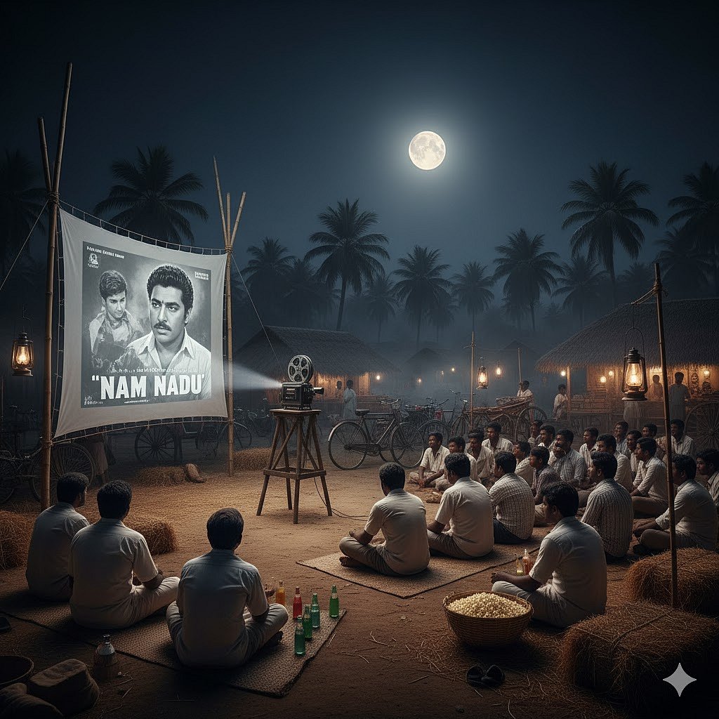 அரங்கத்திற்கு எதிரான பெரும் திறந்தவெளியின் ஓர் ஓரமாக வண்டியைப் போட்டு விட்டு,மாடுகள் இரண்டையும் மூக்கணையில் கட்டி, வைக்கோலைப் போட்டு விட்டு,படம் பார்க்கப் போனோம்!
