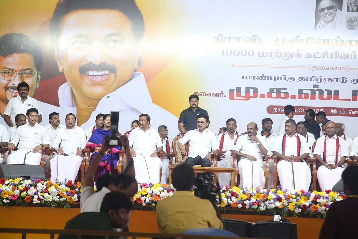 இதையடுத்து முதல்வர் ஸ்டாலின் பேச ஆரம்பித்தார். அப்போது எம்.எல்.ஏ துரை.சந்திரசேகரனிடம் கனிமொழி ஏதோ சொல்லிக் கொண்டிருக்க, கனிமொழி அருகில் அமர்ந்திருத்த கே.என்.நேரு, சைகை மூலம், கனிமொழியிடம் முதல்வர் அமர்ந்திருந்த நாற்காலியை காட்டி அதில் அமரச் சொன்னார்.