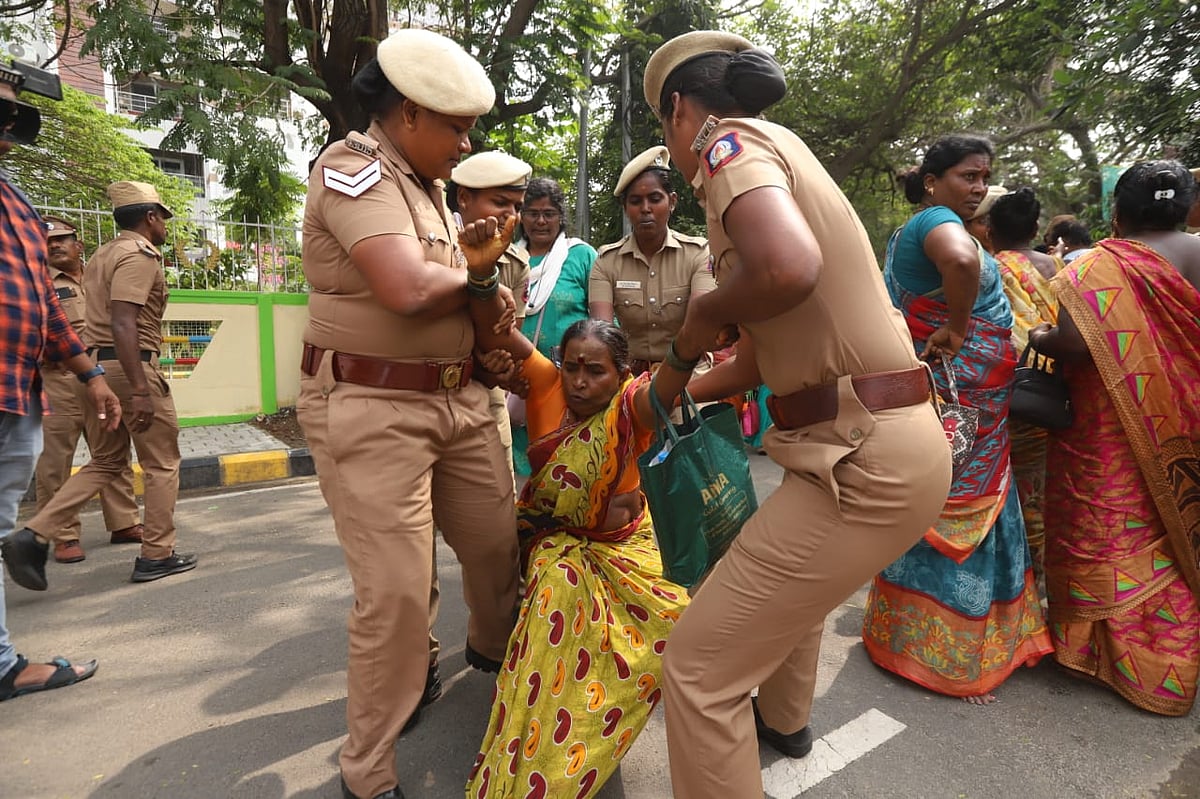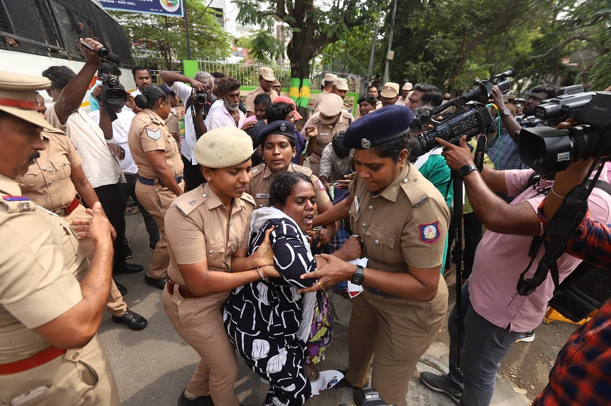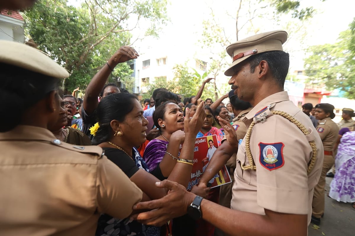 தனியார்மயத்தை எதிர்த்தும் பணி நிரந்தரம் வேண்டியும் சென்னையில் 150 நாள்களுக்கு மேலாக தூய்மைப் பணியாளர்கள் போராடி வருகின்றனர். இந்நிலையில், இன்று கீழ்ப்பாக்கத்தில் உள்ள சென்னை மாநகராட்சி ஆணையரின் வீட்டை முற்றுகையிட்டு போராடிய தூய்மைப் பணியாளர்களை காவல்துறையினர் குண்டுக்கட்டாக கைது செய்தனர்.